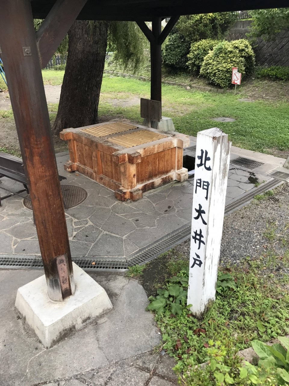 松本城の近くの児童公園の中にある井戸です。松本城の総堀が埋められた際に、この井戸が作られたそうです。松本城の北門にあったのでこの名前がつけられました。現在では、立派な東屋に覆われて、木に囲まれた井戸から勢いよく水が流れでていました。風情があります。