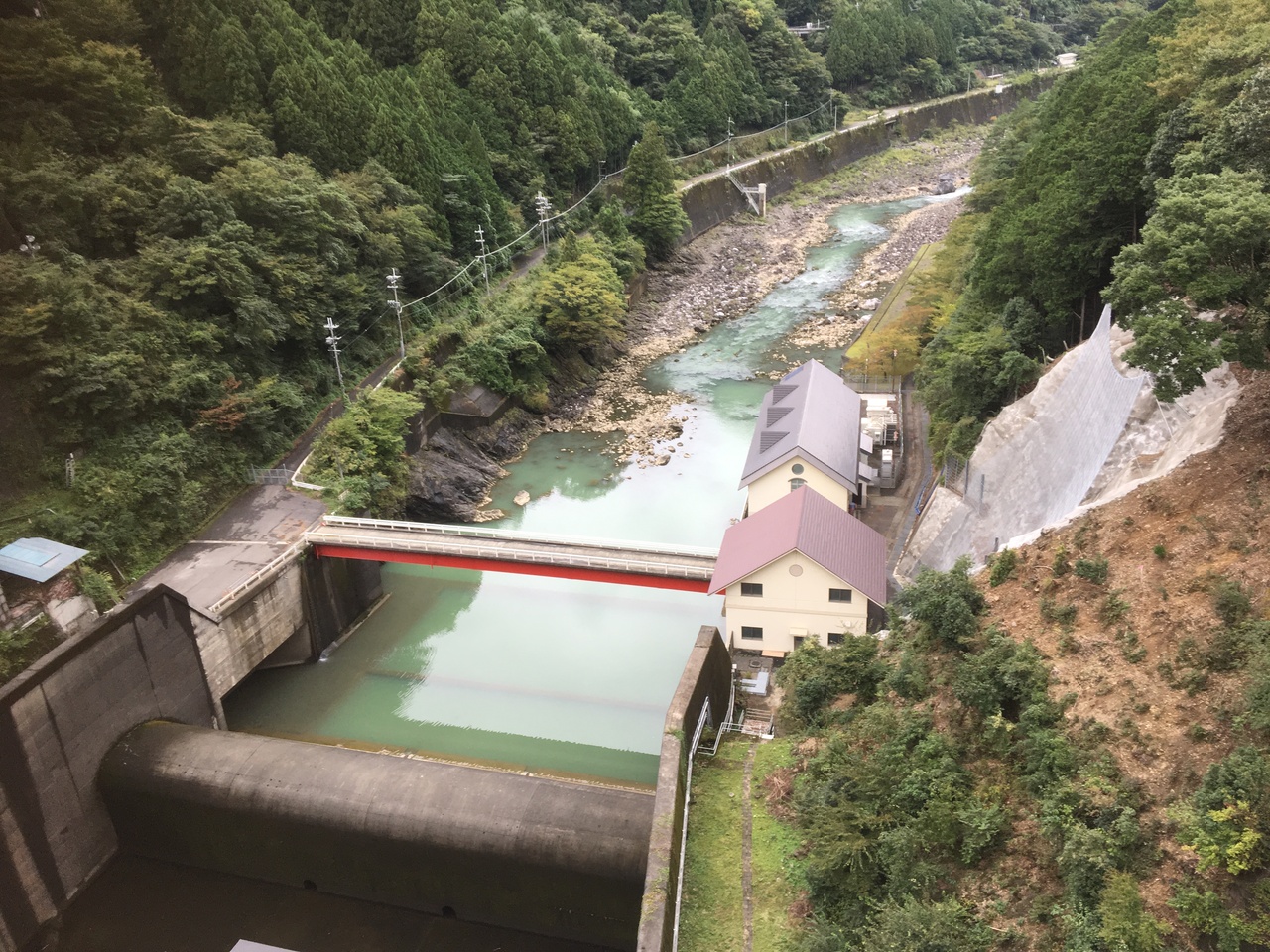 国道169号線から入之波温泉に行く際にダム堰堤を渡りました。対抗車が来ると、ちょっと離合が難しい横幅です。ダム堰堤の両端に駐車スペースがありました。車を置いて、ダム堰堤から下流側を除きこむと、高さがあるので、とても迫力がありました。入之波温泉に行く際に、車を下りて見ることをオススメします。
