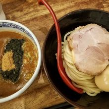 魚介系のスープはかなり濃いめのお味、こってりは好きな方ですがこちらのスープはこってりと言うより濃い味でした。。