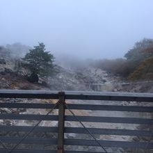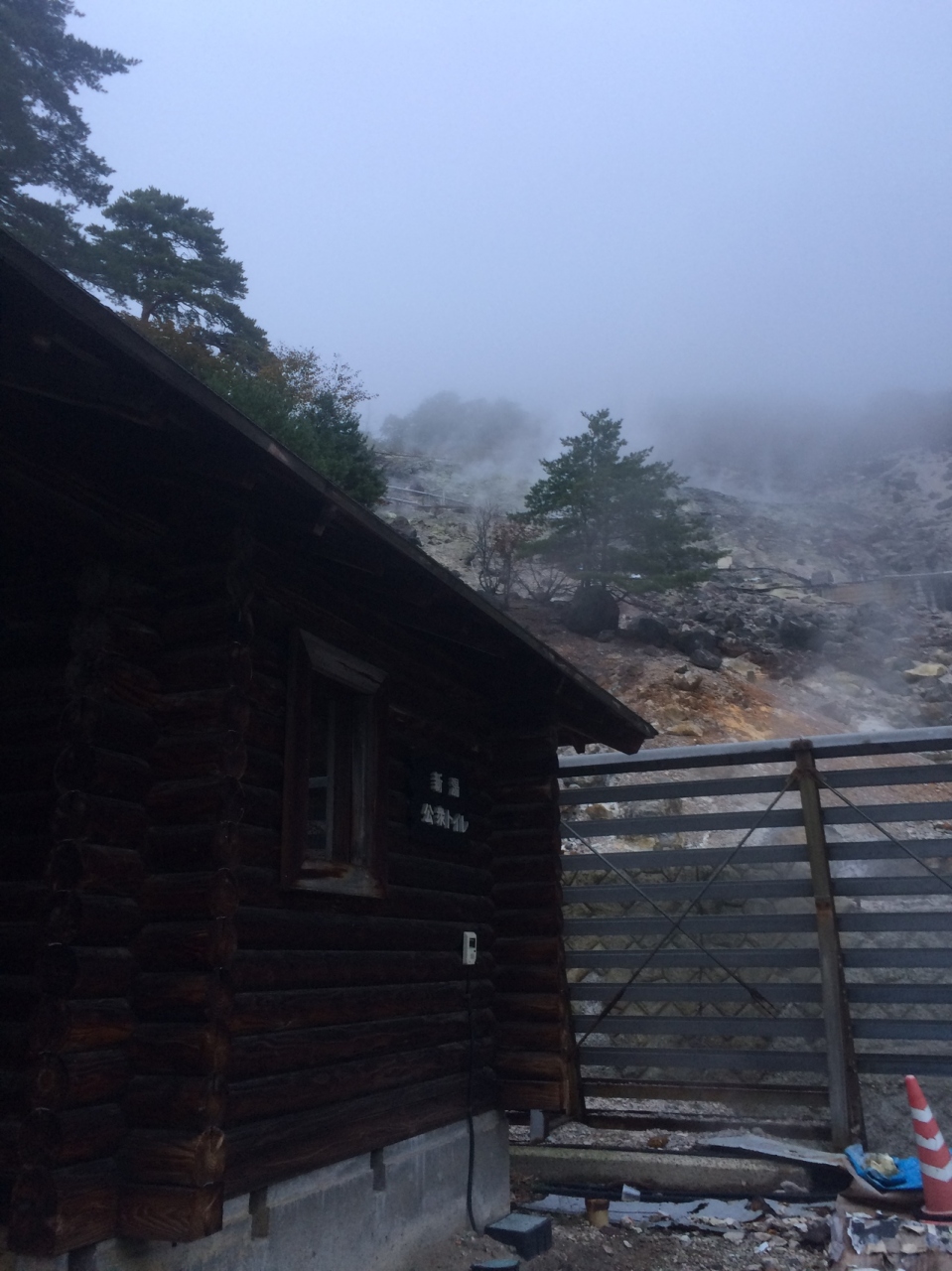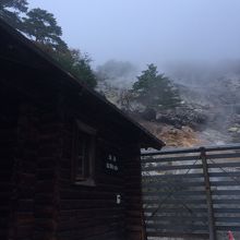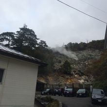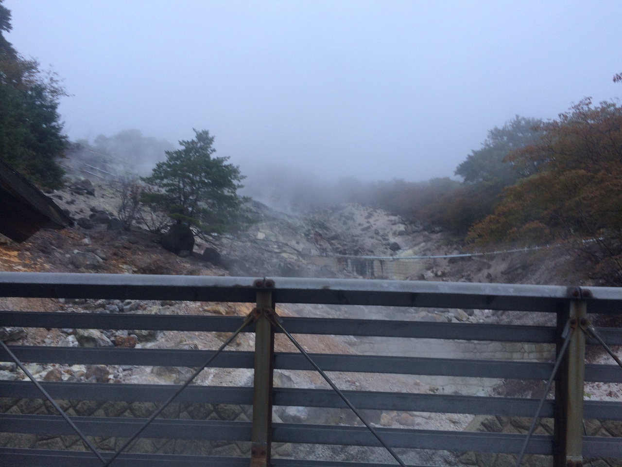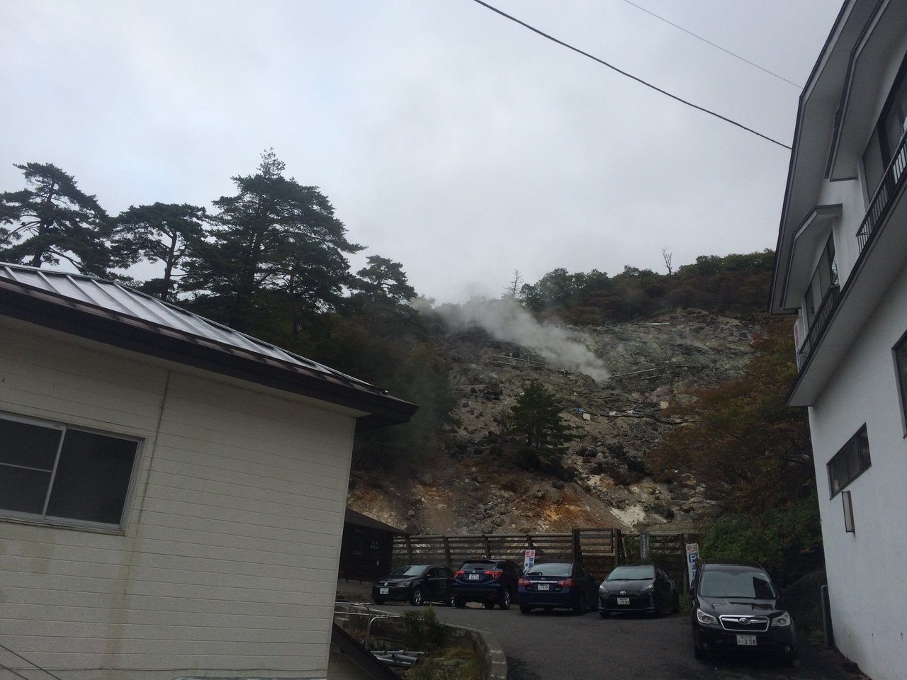新湯温泉乳白色着くと硫黄の匂いが漂い、上を見上げると木々がなく岩がある場所があり煙りが吹き出していました。柵があり危険な為、立ち入り禁止の看板もあります。噴火口のお陰で新湯温泉には乳白色の良い湯が湧き出ています。