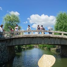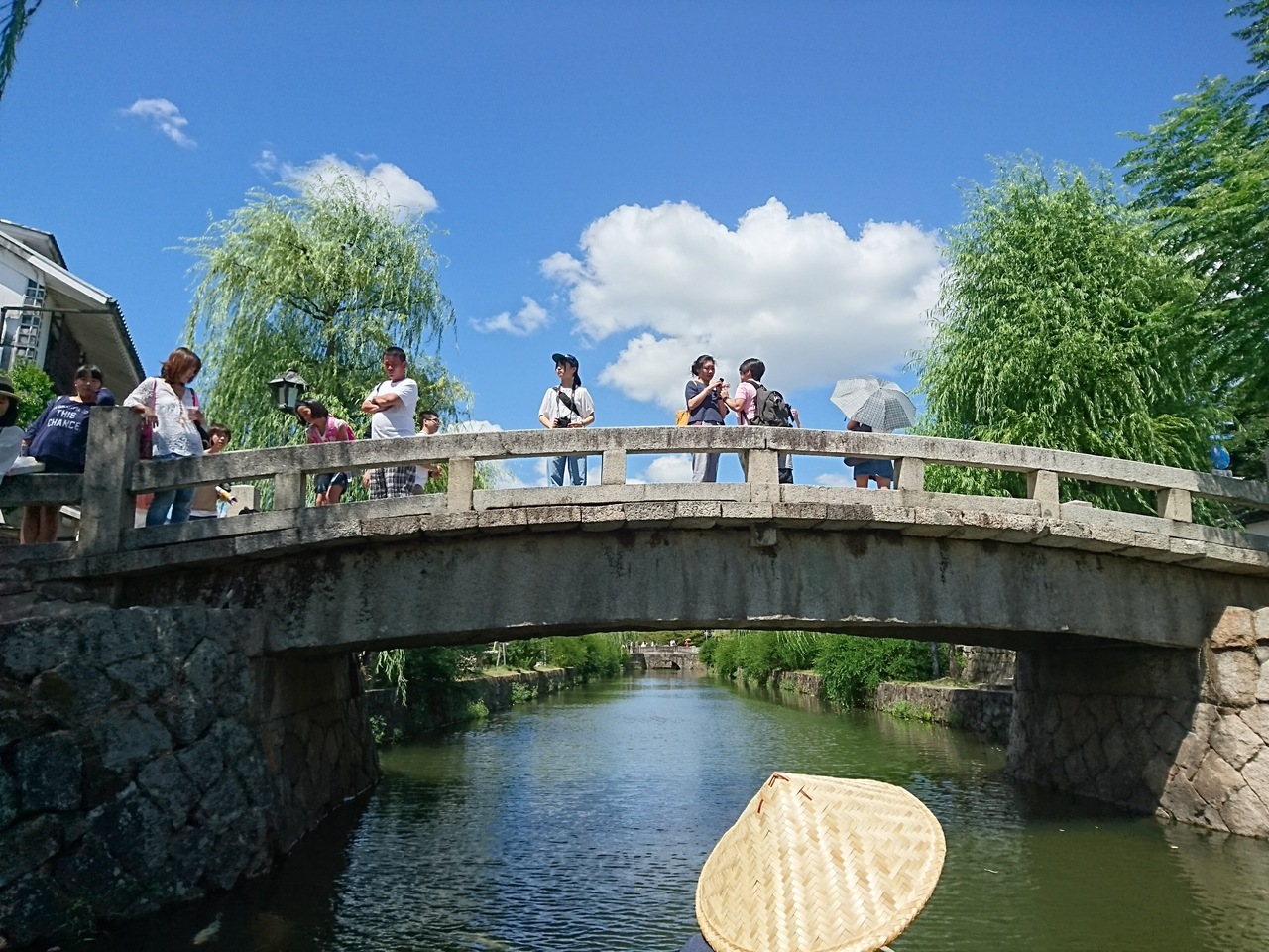 中橋のあたりから乗船し、藁の傘を被り、まずは今橋まで行き、大原家や有鄰館、大原美術館を川から眺め、また中橋まで戻り、つづいて高砂橋方面に行き、倉の跡や、荷揚げ場所などを見ながら戻って来ます。