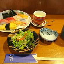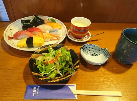 平日のお昼時に伺いました。テーブル席は空いてなく、カウンター席に案内されました。握り定食やちらし定食が、サラダ、茶碗蒸し、味噌汁付きで1,000円からありとてもお得です。注文時にご飯を少なめにするかどうか確認がありました。特に小食でもないので、そのままでお願いしました。そのままでも握りは小さ目で、十分に食べきれる量でした。