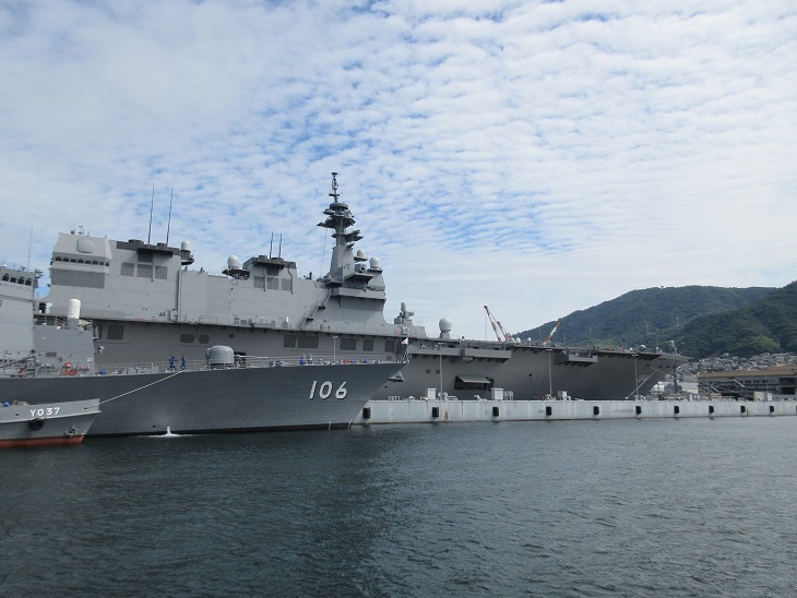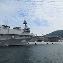 呉中央桟橋から出発。30分で自衛隊の艦船を船上から見学できます。私は午前11時のツアーに参加しましたが、毎日何便か運航されているようなので呉観光の際に行程に組み入れると良いですね。潜水艦に加え、丁度「かが」というヘリコプター搭載護衛艦が入港していて全長200mを超える迫力ある姿を見ることが出来ました。