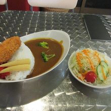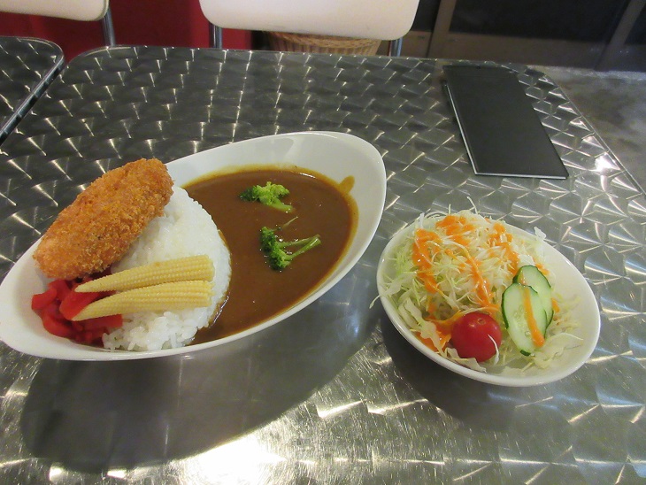 大和ミュージアムのすぐ前にある、ミュージアムの駐車場ビル2階にあるお店で、海軍さんのイメージの内装がされた店内で、「東郷さんのコロッケカレー」を注文。コクのある大人向けの味付けのカレーはサラダもついていました。団体さんの利用が多いようで、入り口には団体利用のため20分待ちと書かれていましたが、一人と告げたらすぐに案内してもらえました。