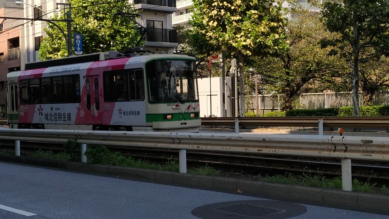 この線路沿いを歩くたびに、ハイテンションになっていたこどもたち。意外と頻繁に都電荒川線が走っていて、すれ違うことができます。紫、ピンク、緑のものなどをよくみかけますが、広告宣伝用のものもよく走っています。