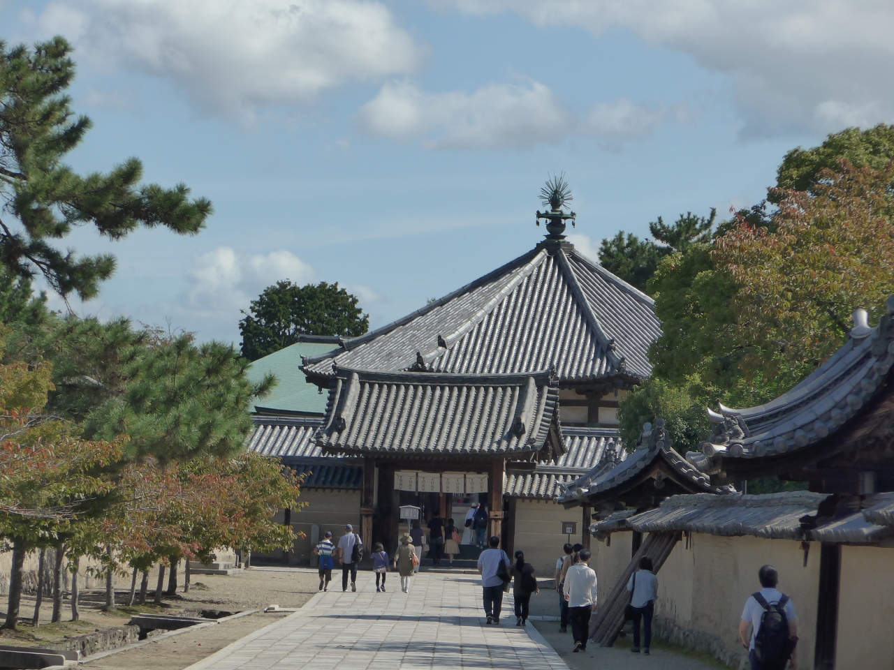 法隆寺西院から数分歩いて東院の夢殿へ歩いていく途中には宝蔵などもあるが、道の両側の土塀が適度に崩れていて時間経過が感じられる。夢殿自体は近くもよいが、遠方から近づいていく途中の屋根が次第に近づいていくところで美しいと感じた。