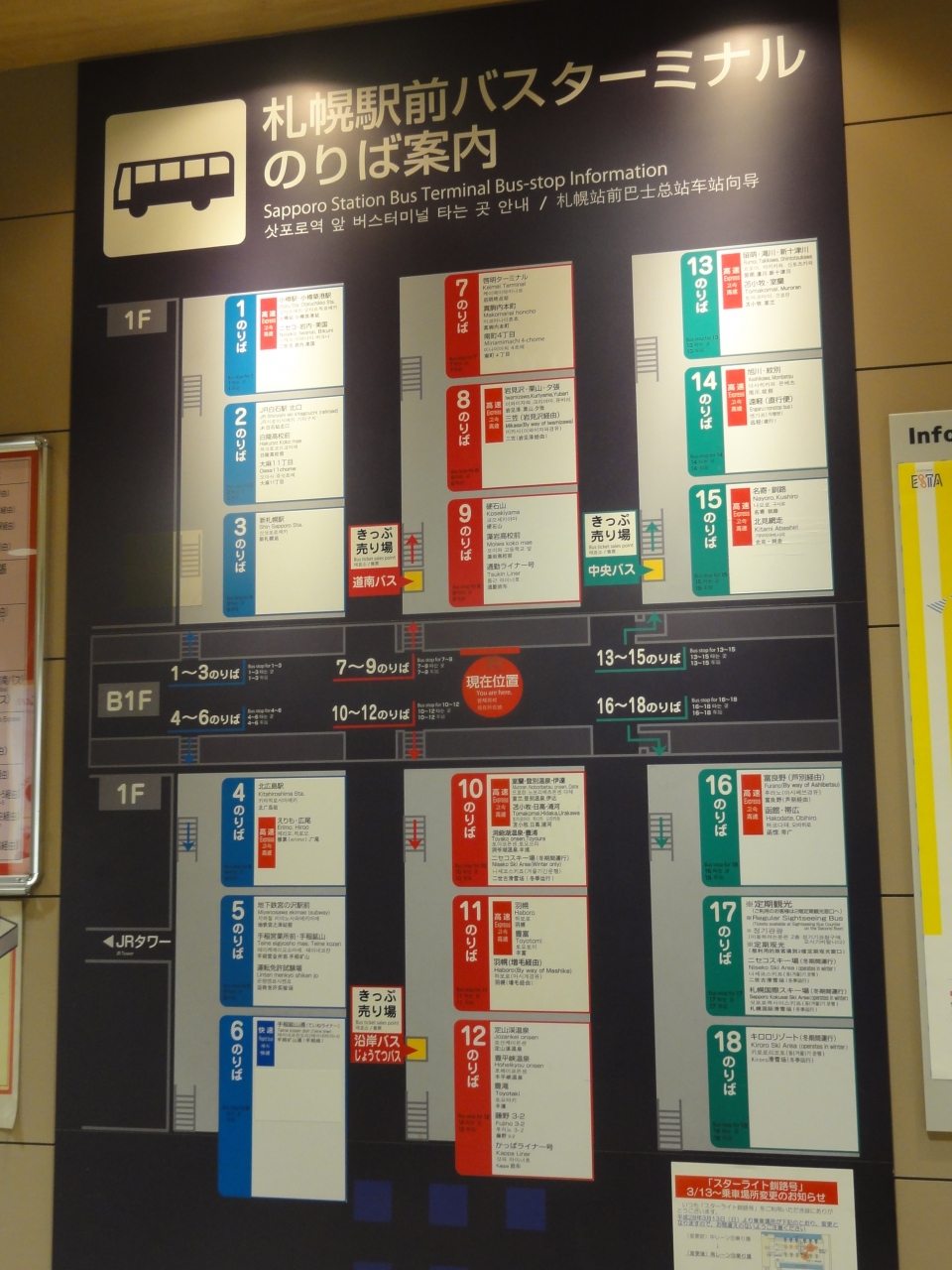 地方への高速バスも出てる札幌駅直結のバスターミナルです。位置的にはESTAの一階部分で、ESTA内のバス乗り場に通じるところには椅子もあります。沿岸バスで羽幌に行く時に利用しました。沿岸バスに問い合わせたところ、混雑時はバスの増便も必要になるので事前予約必要でした。