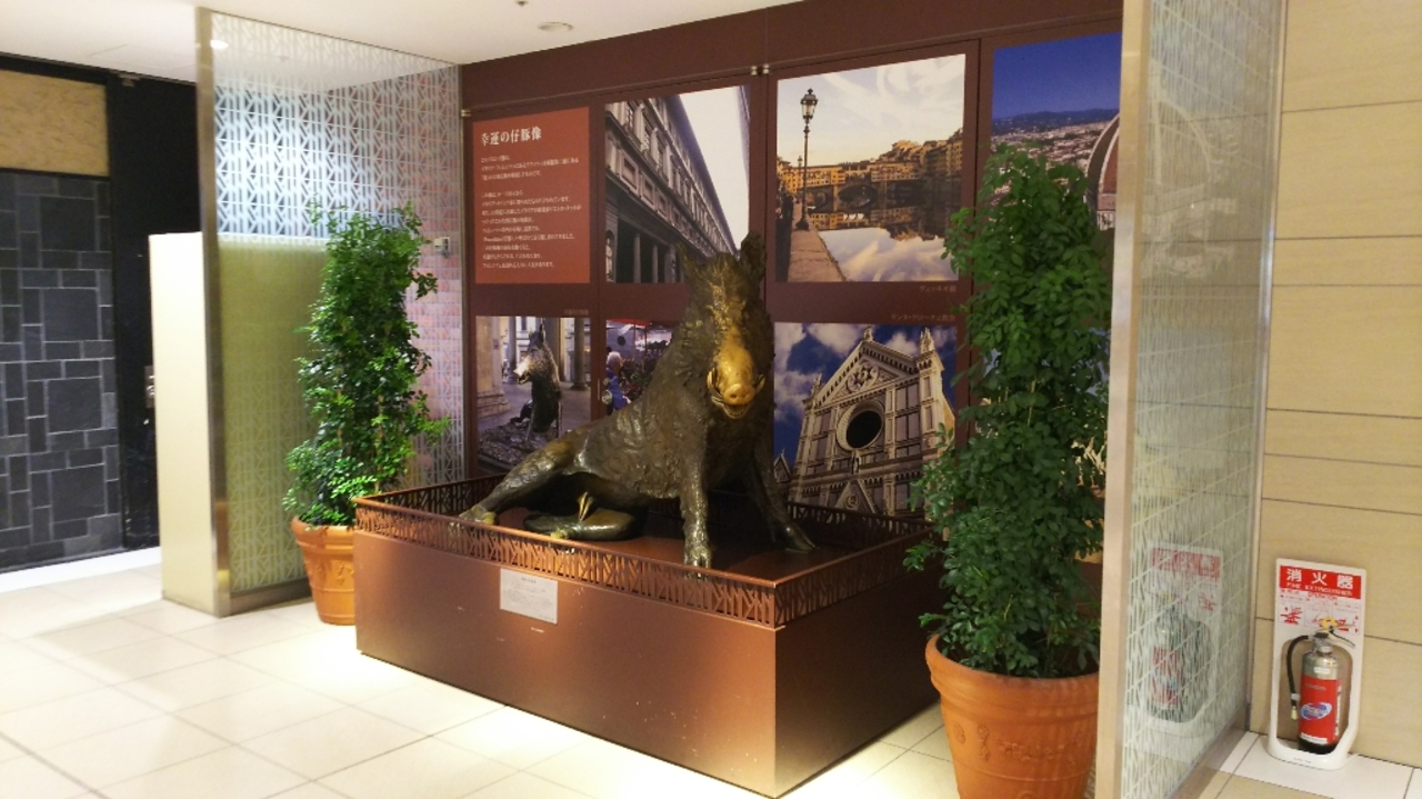 八重洲地下街にある仔豚の銅像です。イタリア・フィレンツェのウフィツィ美術館にある「猪」の大理石像の模刻で鼻の上を撫でると幸運を呼ぶと言われているようで鼻の上だけは色が変わっていました。仔豚の銅像と言ってもかわいいキャラクター系の銅像ではありませんが、近くに行ったら立ち寄ってみるのも良いです。