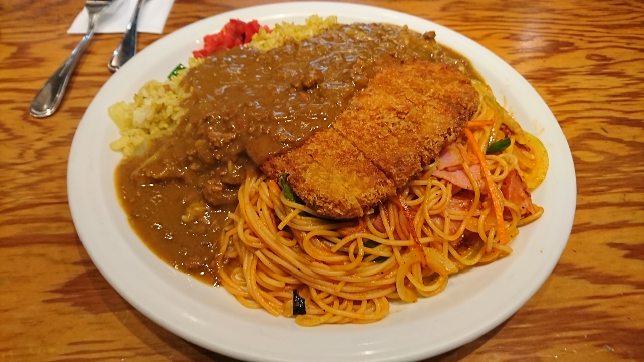 春吉にある洋食屋さん。明るい店内は、カウンター席とテーブル席が少々。店主の趣味なのか、釣り関係の広告が並びます。名物はトルコライス。普通盛り、大盛り、バカ盛りとあり、大盛りは普通盛りの2倍、バカ盛りは3倍もあるとか。普通盛りでもかなりの量があるので、自信がなければ大盛りは頼まないほうがよいと思います。カレーピラフとスパゲティはご主人が、揚げ物サラダは奥さまが担当のようです。注文後揚げるカツはサクサク。カレーピラフは辛さがほどよく懐かしい香り。ナポリタンも昔から食べている細麺の家庭の味。大きな鍋で作られたカレーは、かける前に小さな鍋で暖められ、カツとピラフの上へ。挽き肉カレーは、カレーピラフとのコラボで後から辛さがやって来ます。子供時代に大好きだったカレー、ピラフ、ナポリタン、カツを一気に、しかもかなりのボリュームで食べられる満足度の高いお店です。大盛り以上を完食した人、完食できなかった人だけが書き込むことのできるノートがあります。