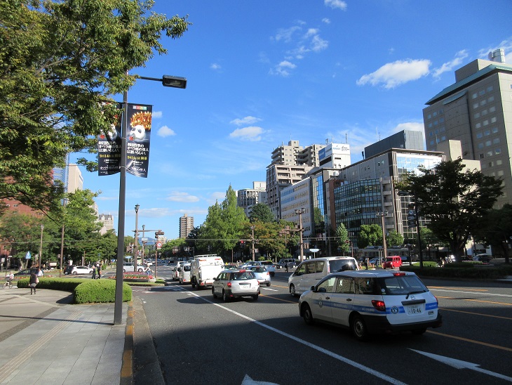 平和大通りは鶴見橋の西側から平和記念公園の南側を走り福島町まで伸びる幅の広い幹線道路です。オバマ前大統領が平和記念公園を訪れた際、テレビのアナウンスでこの平和大通りを走る車列が映っており、今回広島を訪れた際にその場面を思い出しながら歩いてみました。両側は緑豊かな公園のように整備されていて、非常に気持ち良く散歩することができました。