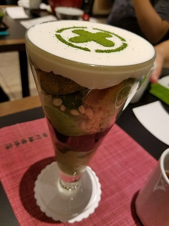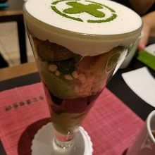 パフェは白いクリームの上に抹茶パウダーで、○十と書かれています。