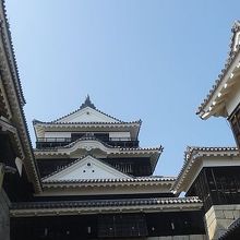 ロープウェイで登った勝山の頂上に本丸があります。頂上は広く平らで桜の木がたくさんあります。桜の名所でもあります。ここは城好きだけでなく、観光客もたくさんいました。大天守の頂上は見晴らしが良かったです。いい風がふいていました。