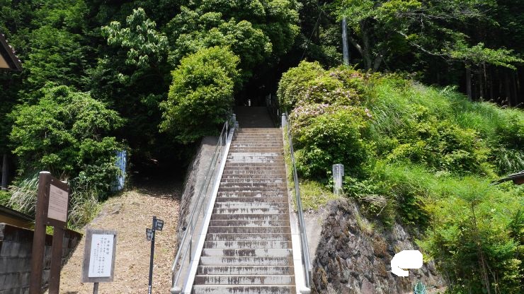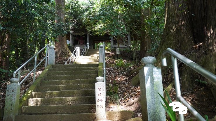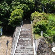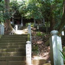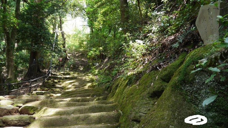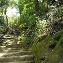 階段と苔むした上り坂の参道は木々に覆われ独特の雰囲気がある。