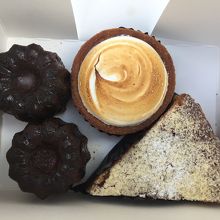 確かに店に入るとショーケースに入ったケーキももちろんあるが それよりもショーケースの外に並ぶ茶色の伝統的なフランス焼菓子たちが目を引く。