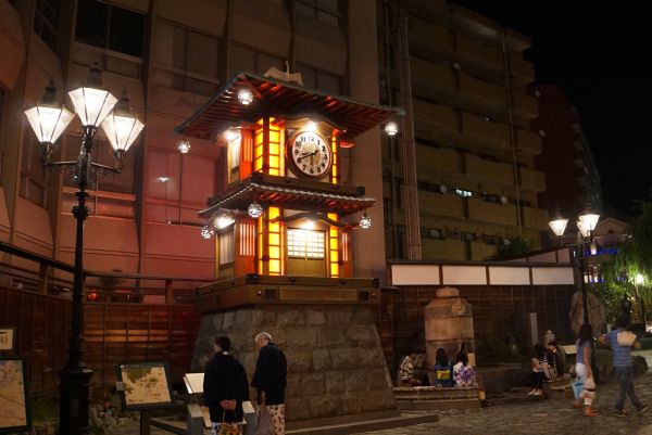 市内電車で終点道後温泉に行きました。夜の街は雰囲気があります。夕食後でほろ酔いだったからかもしれません。なので、前にも入ったこともあり、我々は入らず待っていました。息子二人は揃って入りに行きました。本館の前はたくさんの人でにぎわっていました。
