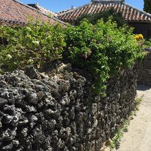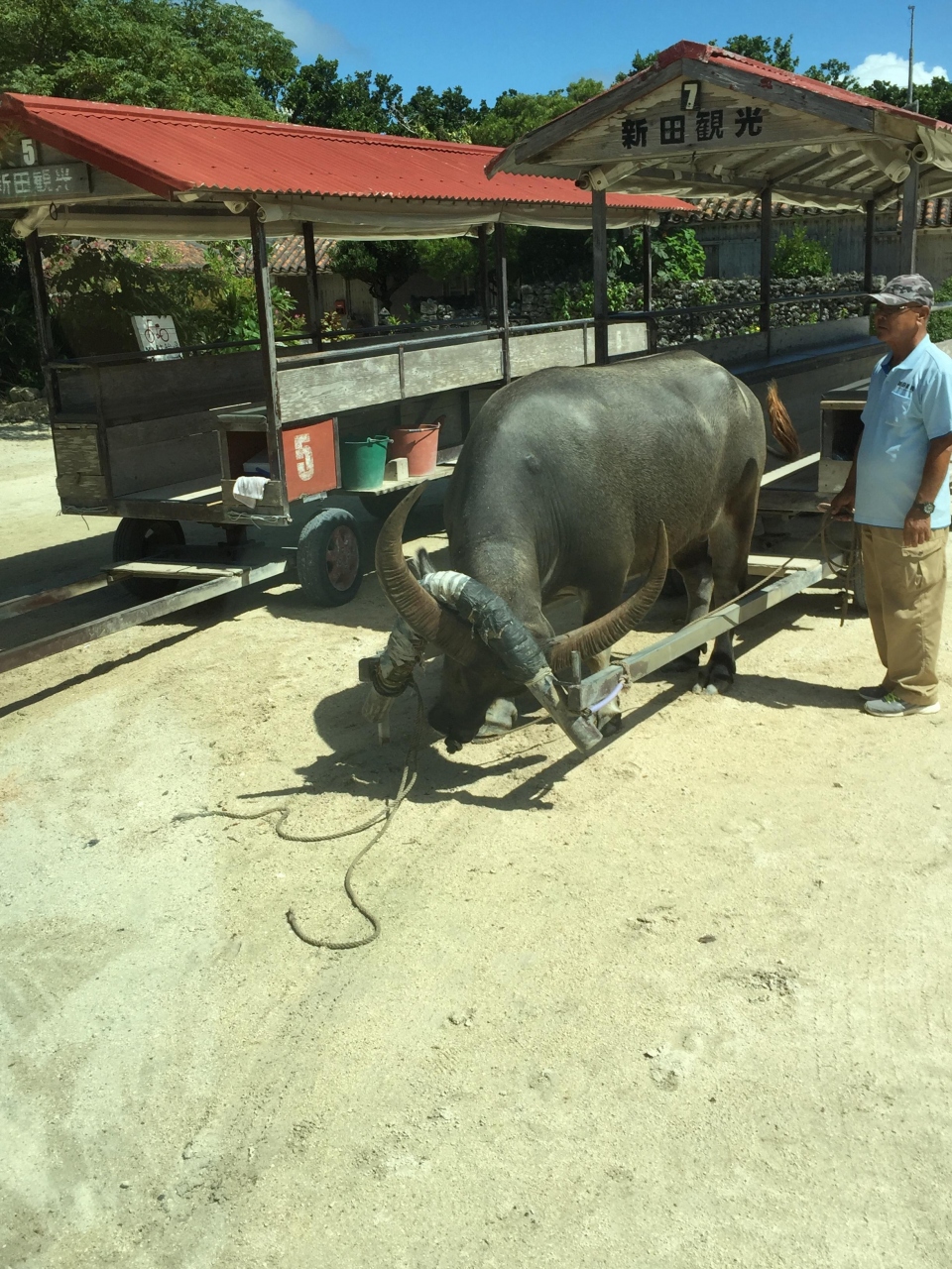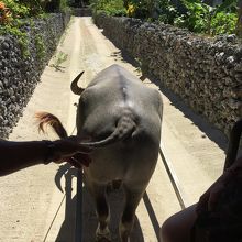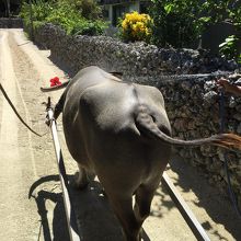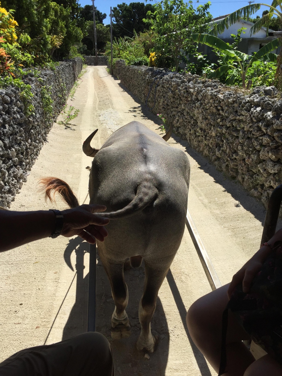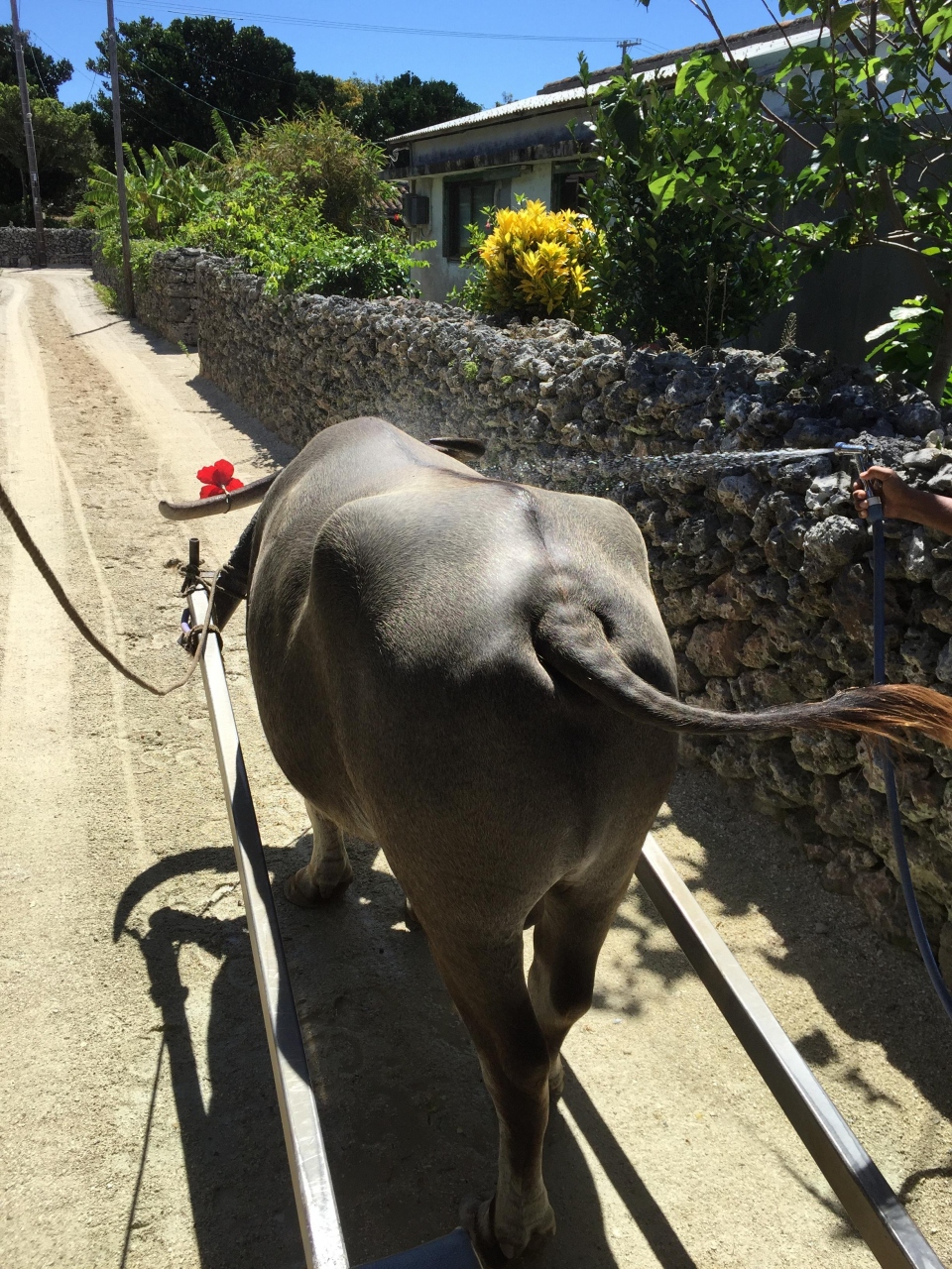 竹富島の石垣壁の間をゆ~らりゆらりと水牛車に乗って、おじいさんのお話を聞きながら進みます。