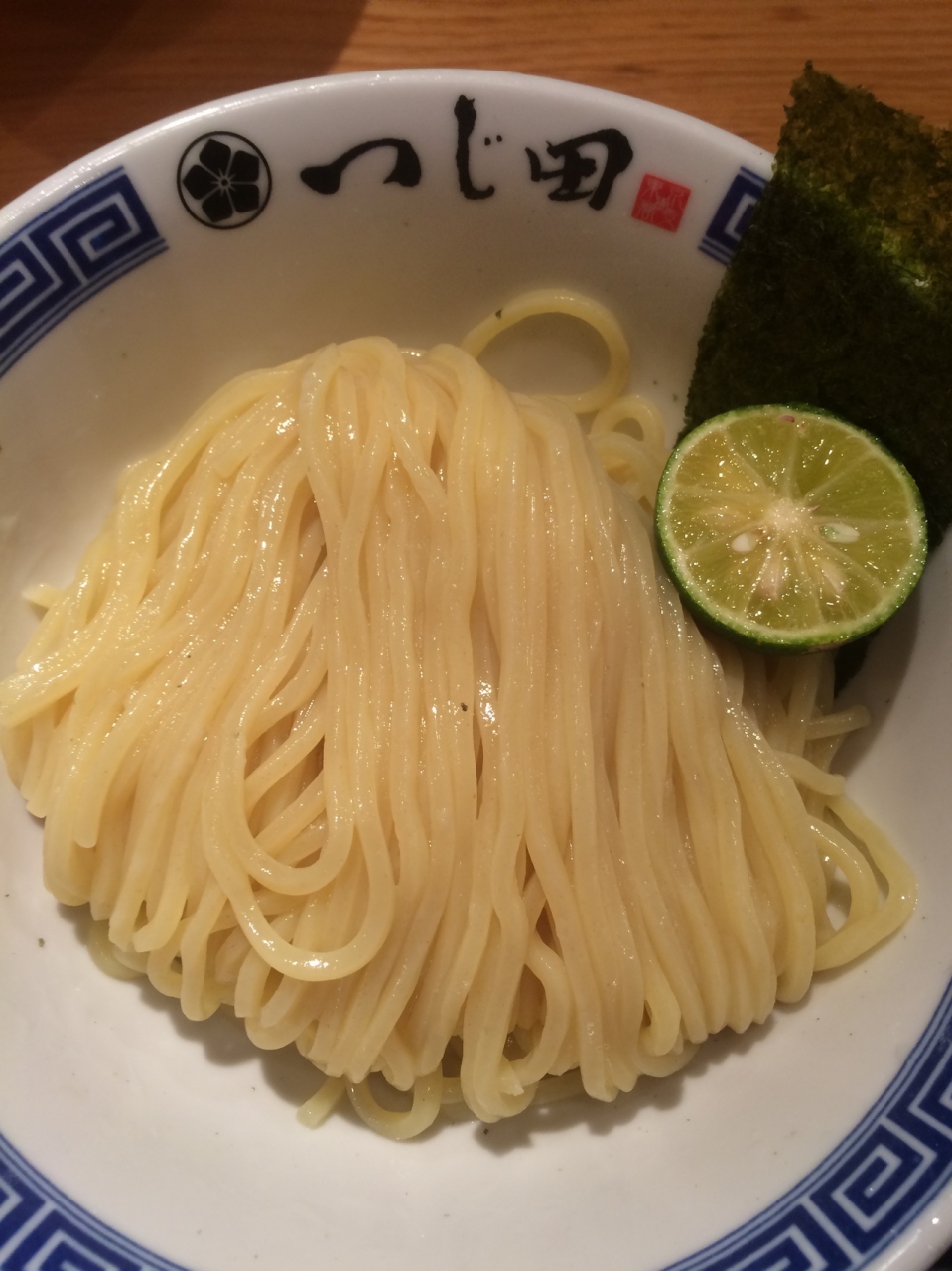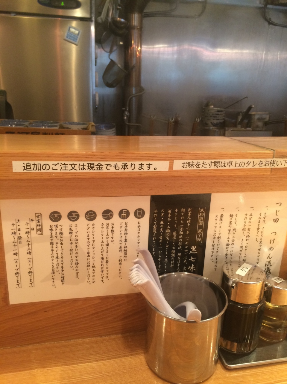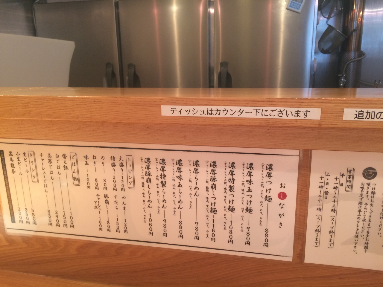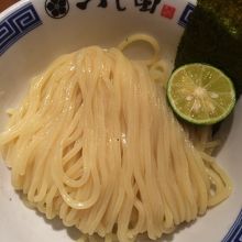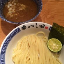 行列の人気店で11時開店前に行きましたが、既に店舗前の椅子席には幾人か人が座っていました。店内はカウンターのみの15人ぐらい座れる座席のみでBGMは和系の琴の曲が流れ落ち着きました。店外に一つ自動食券機があります。濃厚つけ麺を注文、チャーシュー、のり、ネギ、すだち、めんまが入っていて名前の通り濃厚なスープで、麺はクリーミーでまろやかでした。麺半分食べた時点で、すだちをかかると酸っぱさが増し違う味に。最後はスープ割りと言うスープを足してもらい薄味にしてスープ飲み干しました。