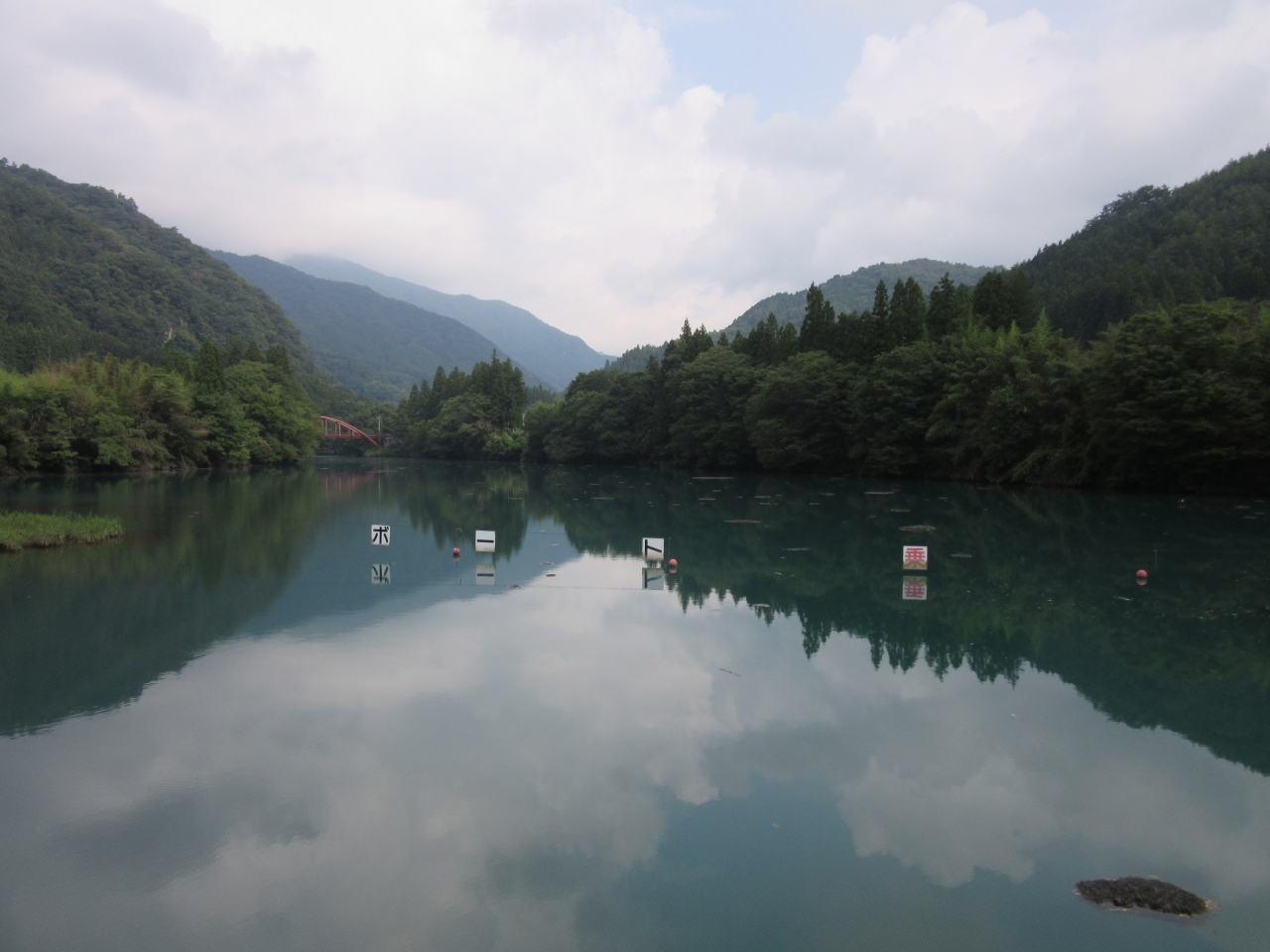四万湖自身は上流に四万川ダムがあるおかげか、洪水期でも水位を減らしておらず、湖面と植生の間に土が見えないので、素敵な雰囲気を醸し出しています。