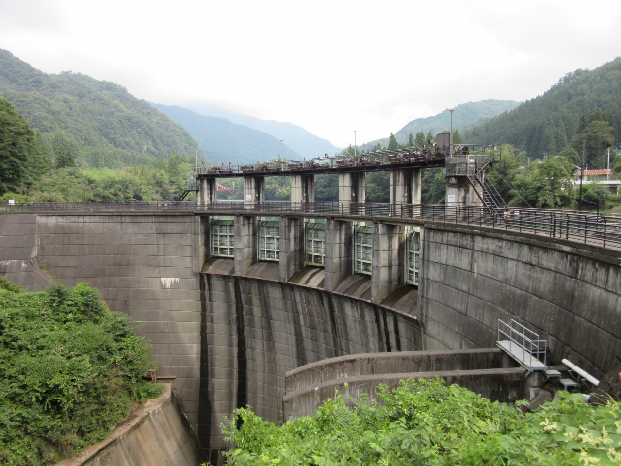 アーチ式ダムとはダム湖の水圧を左右の岩盤に逃がして受け止めるような構造で、ダム提体がアーチの様に湾曲しています。
