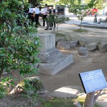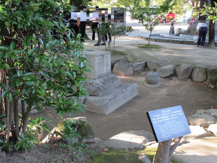平和記念公園の中、戦没者慰霊塔から北西側にある原爆の遺構で、私が訪れた際には修学旅行の生徒さんらが熱心にボランティアガイドの方の説明に聞き入っていました。戦前この場所に「慈仙寺」というお寺があり、そこの墓石が原爆の爆風によりこのように倒壊してしまったのだそうです。すさまじいその破壊力を垣間見る思いがいたしました。