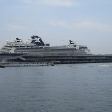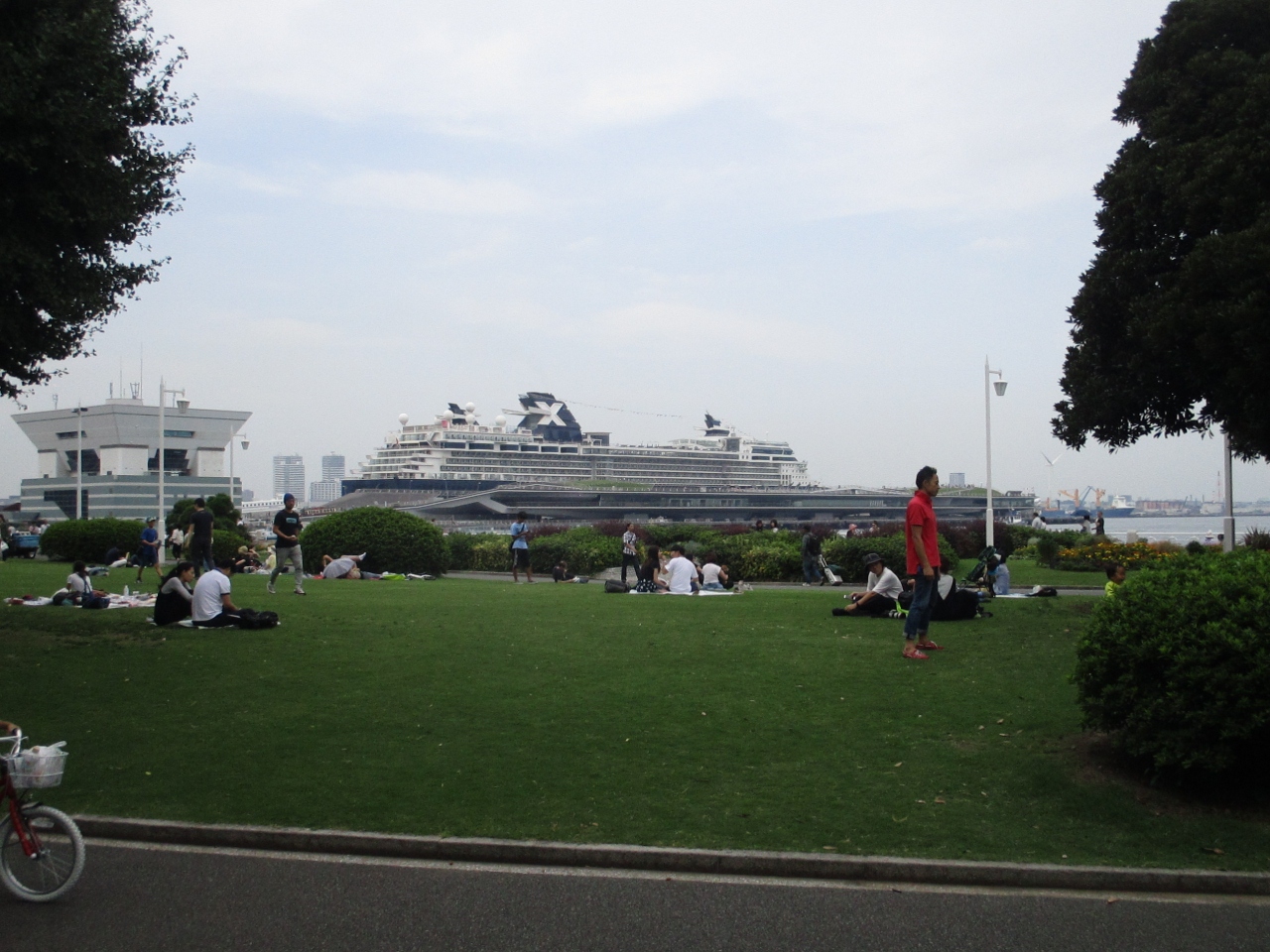 山下公園の海側へ出ると、横浜港大さん橋国際客船ターミナルが良く見え、桟橋に停泊している某クルーズ船も見えました。