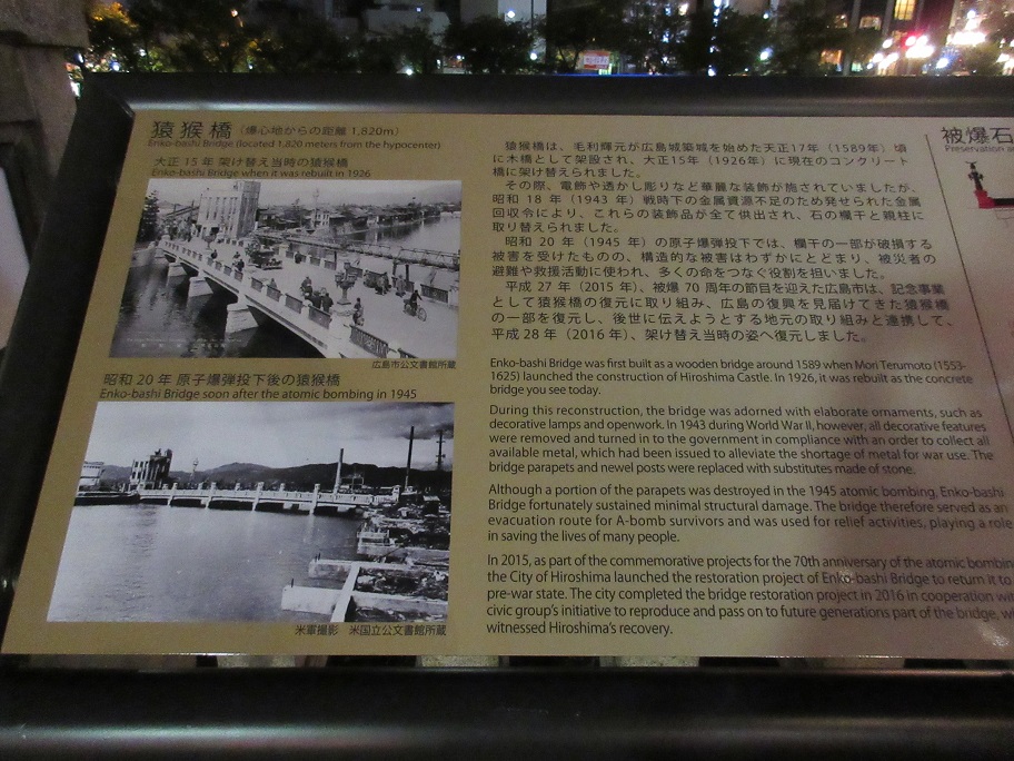 広島市電に乗って広島駅に向かうと一つ手前が「猿猴橋」停車場です。時間があったので、そこで降りて散策した際に訪れたのが、こちらの「猿猴橋」です。「えんこうばし」と読むようです。橋の袂に説明文があり、原爆で大きな被害を受けたのち、大正時代の姿に復元されたこと、また被ばくした材料も多く使われていることを知りました。広島でも一二を争う美しい橋だと思うのですが、そうしたメッセージが込められていることを知る、厳粛な気持ちになりました。