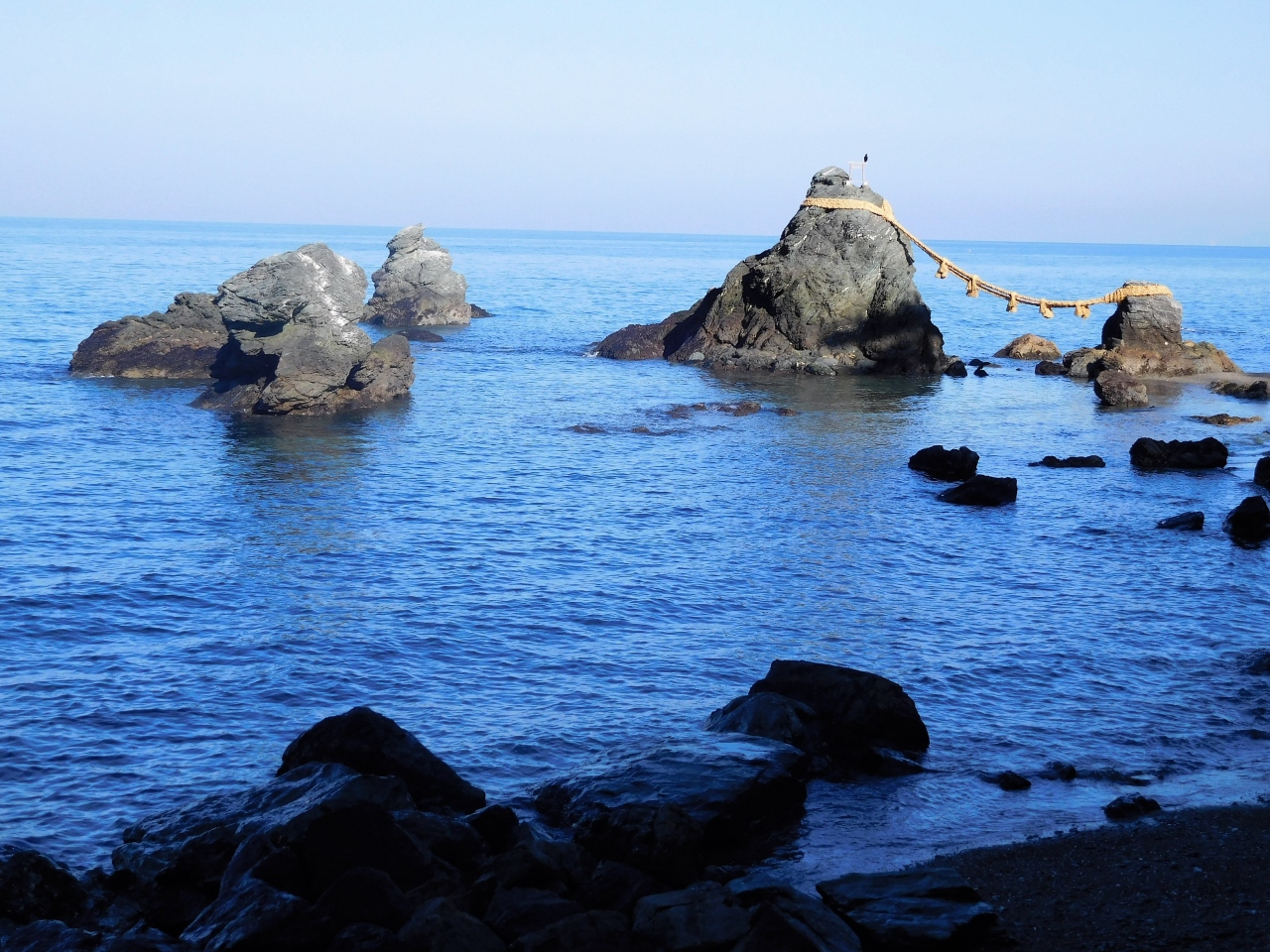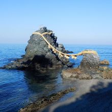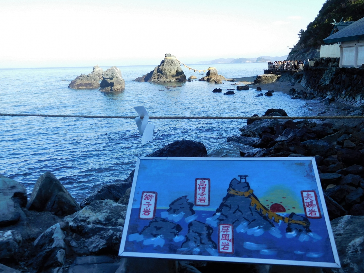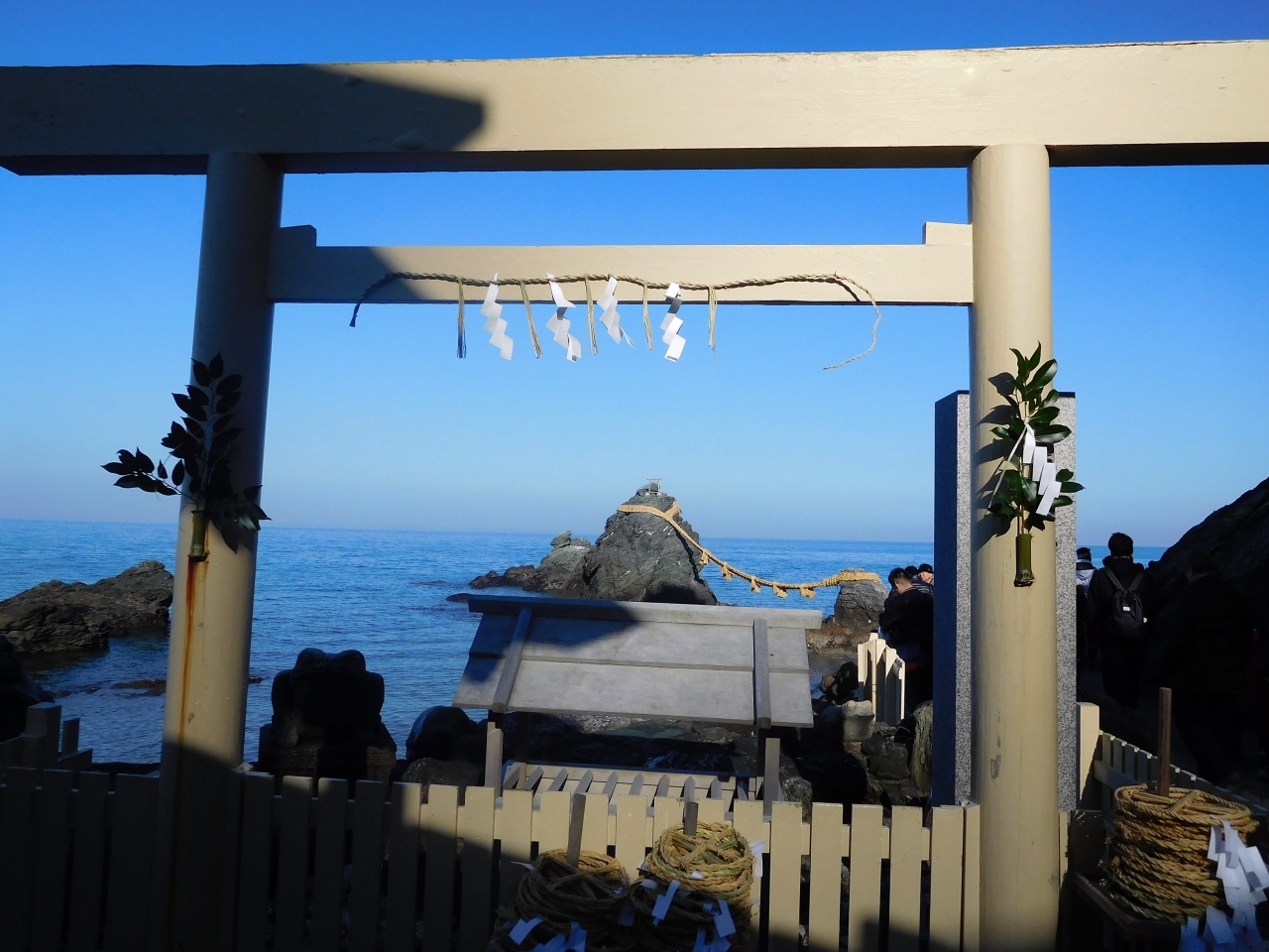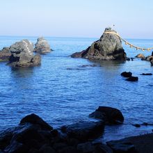 夫婦岩は沖合700mに鎮む興玉神石と日の大神(日の出)を拝する鳥居の役目をしているとのことで日の出、皇居遥拝所もあり霊験新たかな気持ちになります。