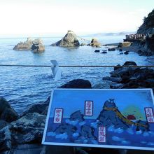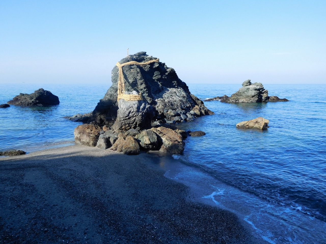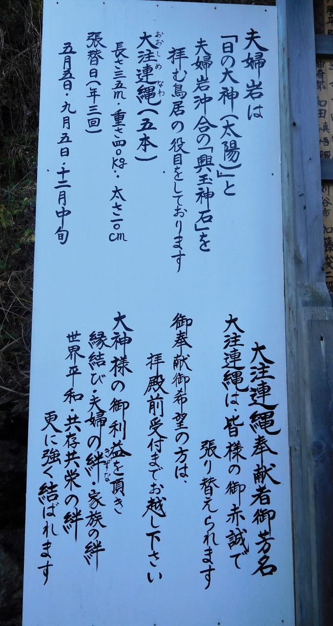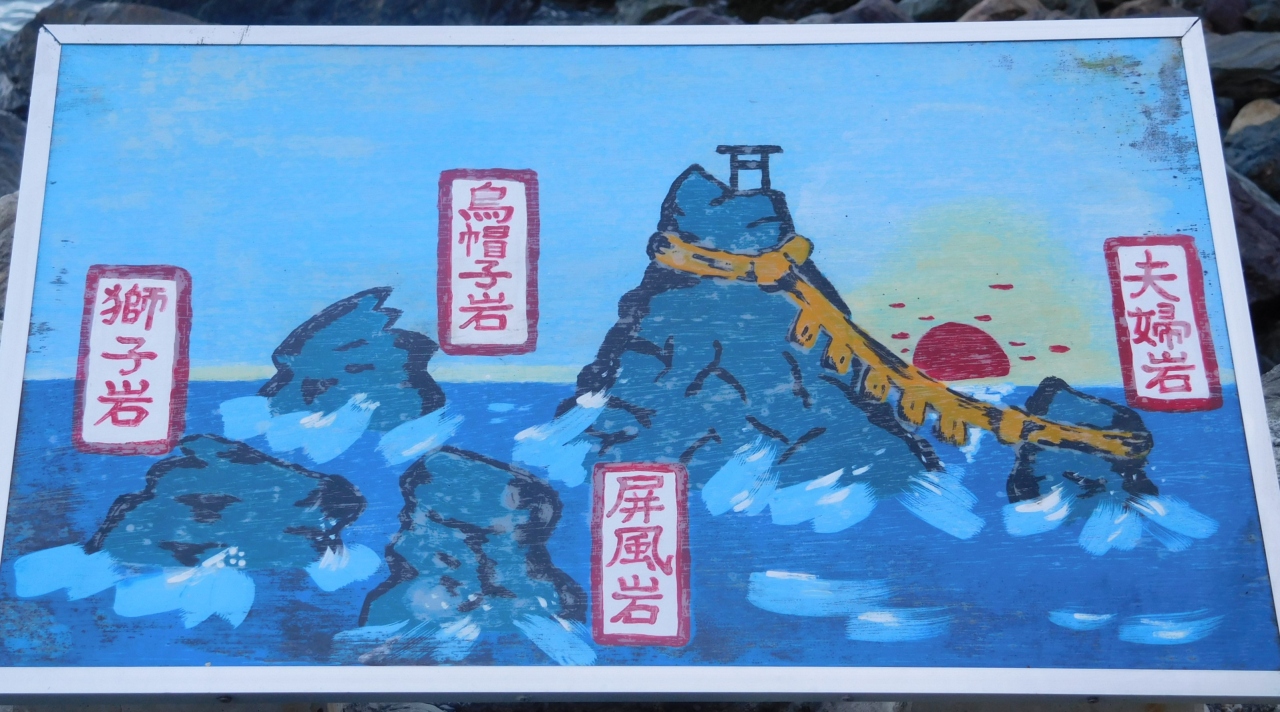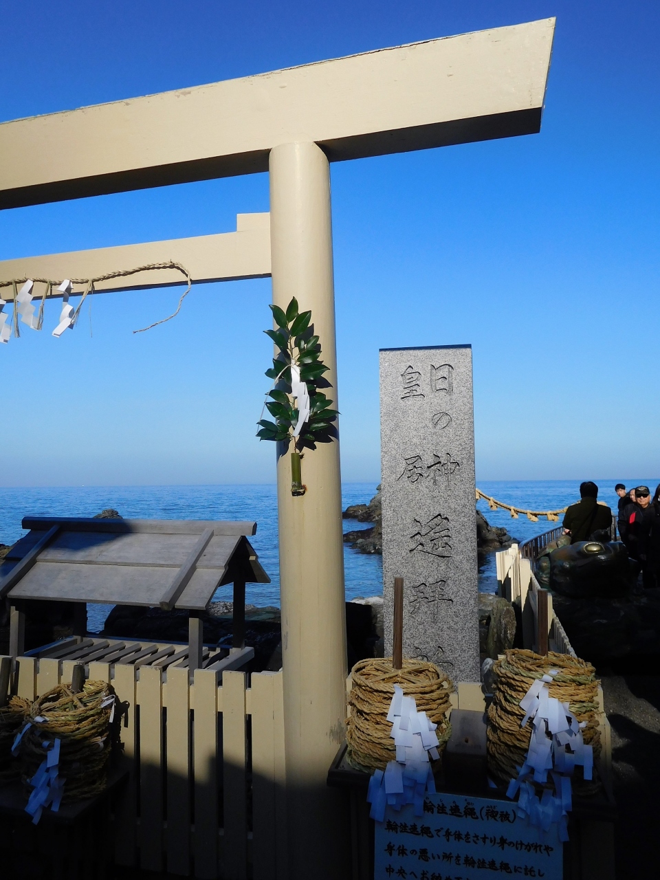 夫婦岩は沖合700mに鎮む興玉神石と日の大神(日の出)を拝する鳥居の役目をしているとのことで日の出、皇居遥拝所もあり霊験新たかな気持ちになります。