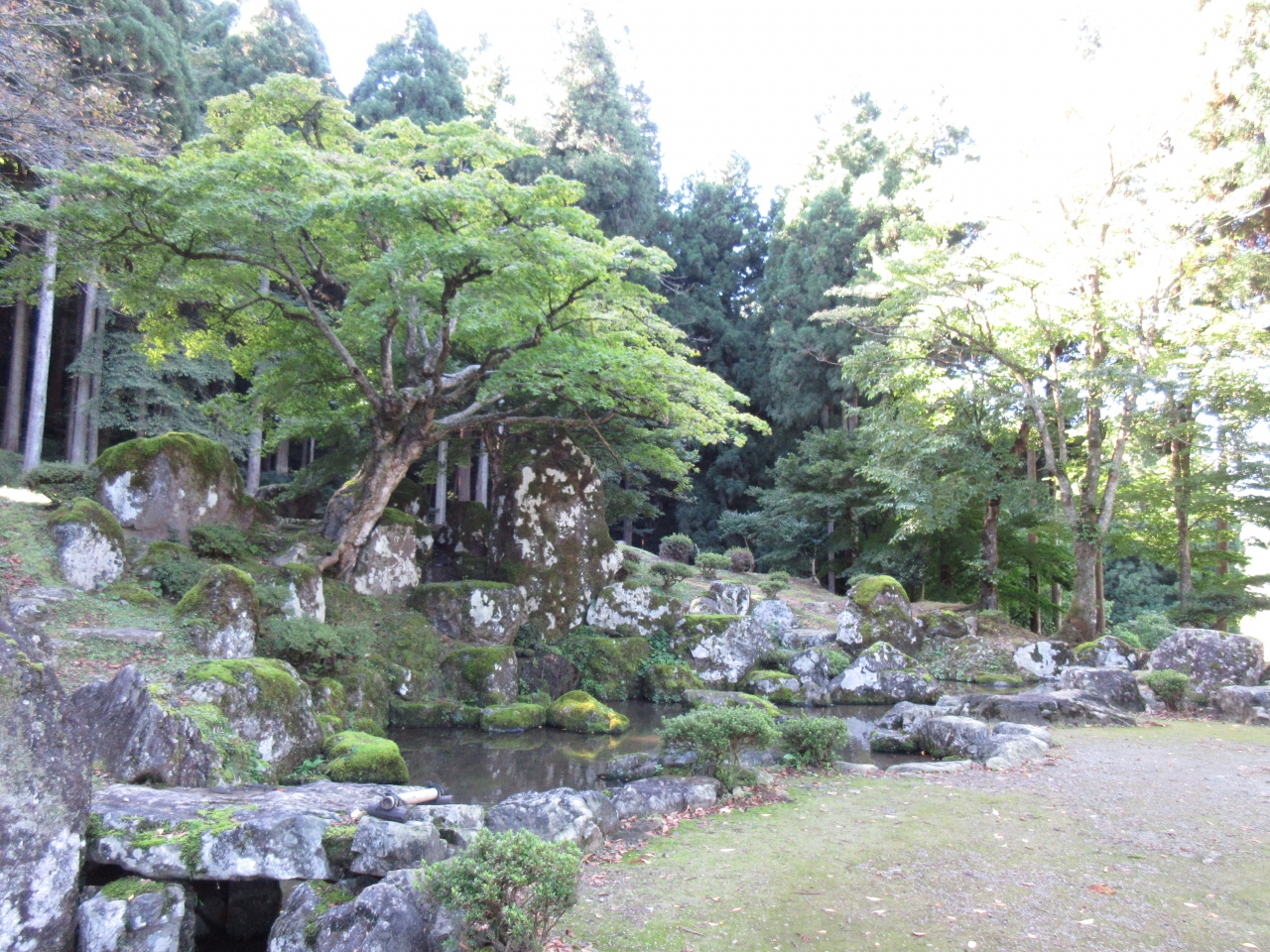 朝倉家5代当主・義景が側室のために造った、一乗谷で最も大きい庭園です。中央には高さ4mほどの大きな石が置かれ、その周囲にはいろいろな大きさの石が配置されています。発掘前は歴代当主の名が刻まれた4mほどの石だけが地上に出ていたため、墓と思われていたようですが、発掘調査で庭園の一部であることが分かったそうです。側室でありながら、庭園まで造ってもらった方は幸せだったに違いありません。