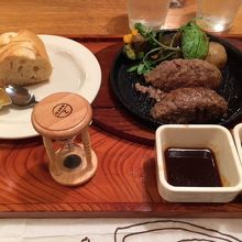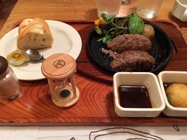プレミアムハンバーグステーキを注文。砂時計で時間をはかって鉄板の上で焼きます。中までしっかり焼けていましたが、つなぎが甘いのか、お箸で食べ始めるとハンバーグがぼろぼろとくずれてしまって食べにくかったです。