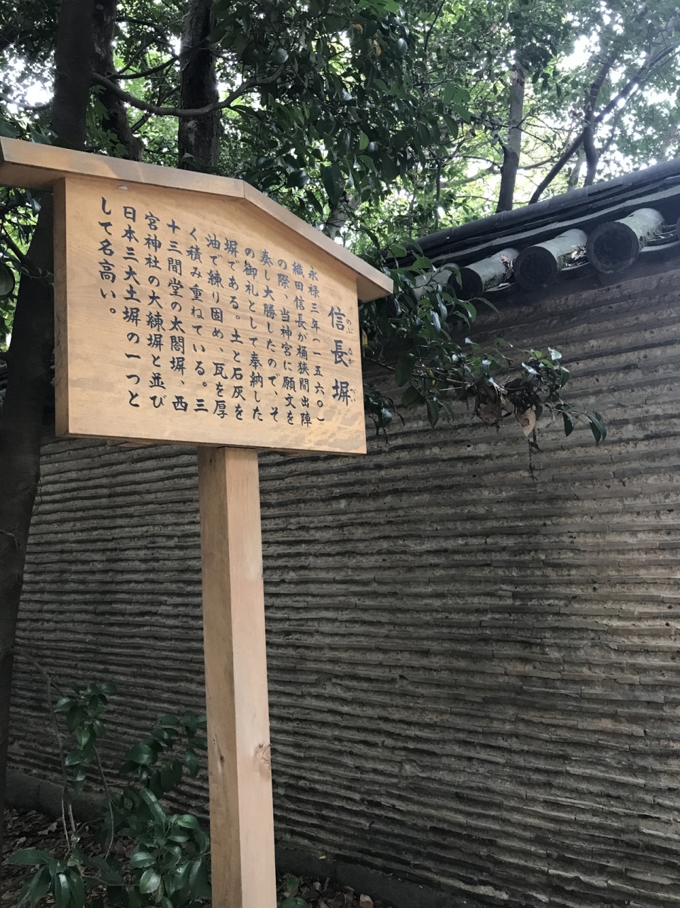 永禄3年に織田信長が桶狭間の出陣の時に、当神宮に必勝祈願をしてみごと大勝したのでそのお礼として奉納した築地塀であります。土と石灰を油で練り固めで瓦を厚く積み重ねたもので、兵庫西宮神社、京都三十三間堂の塀とともに有名です。