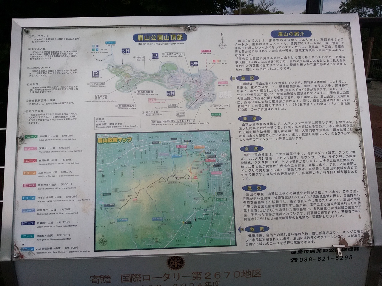 阿波おどり会館からロープウェイで眉山へ上がりました。眉山頂上エリアにある公園で、徳島市街や吉野川、瀬戸内などの景観も望めて、敷地には放送局の鉄塔やパゴダ平和記念塔、モラエス館などがありました。裏手に駐車場があり、ドライブでも来られます。