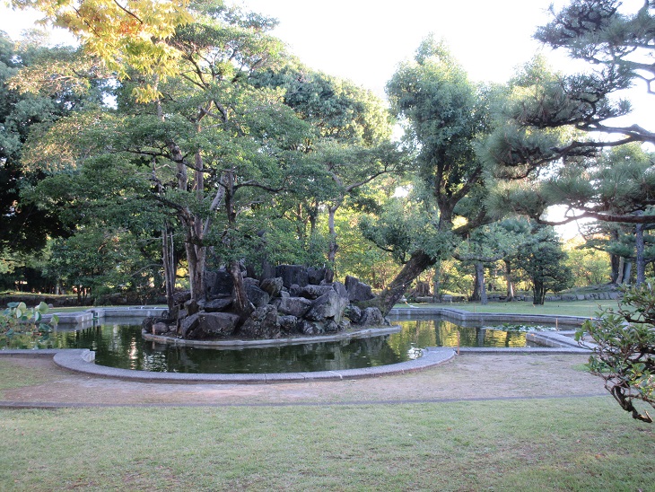 広島城の本丸を散策している際に、池の真ん中に桜の木が植えられた中の島が作られた奇妙な池がありました。桜の池と名前があり、これは広島に水道が引かれたことを記念して1898年に築造された池とのこと。何本からの樹木があるのですが、花を咲かせる時期でもなくて訪れる人もおらず、まるで忘れ去られたかのようで寂しい感じがしました。