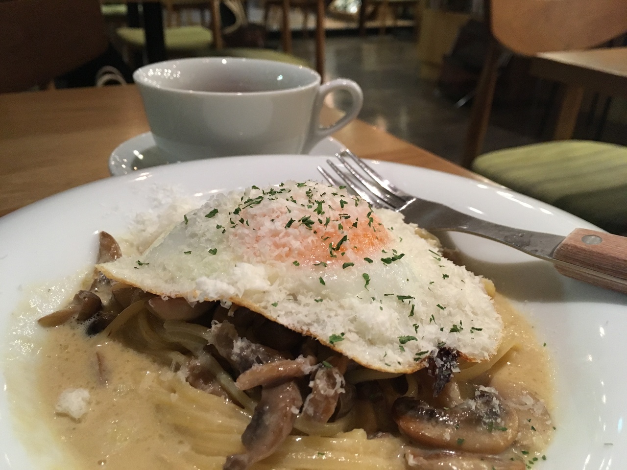 ゆるゆる待っているとパスタ登場。パスタはしっかりもっちりアルデンテ、たっぷり入っているキノコとよく混ざり合う。上に乗っている目玉焼きがちょっと切り分けにくかったのが少々難点だが、全体の味は十分に及第点というか美味しい。