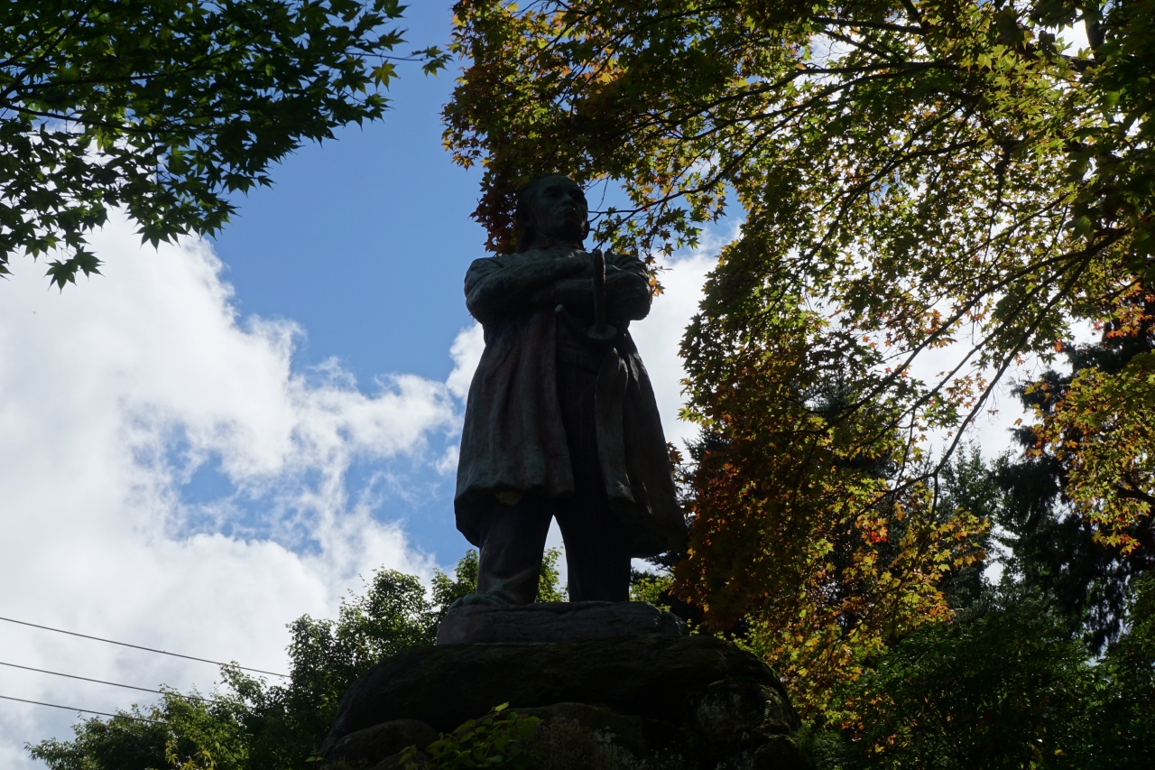 板垣退助銅像は、神橋のたもと。少し高い場所にあるのですが、木に隠れてちょっと分かりにくいかもしれません。
