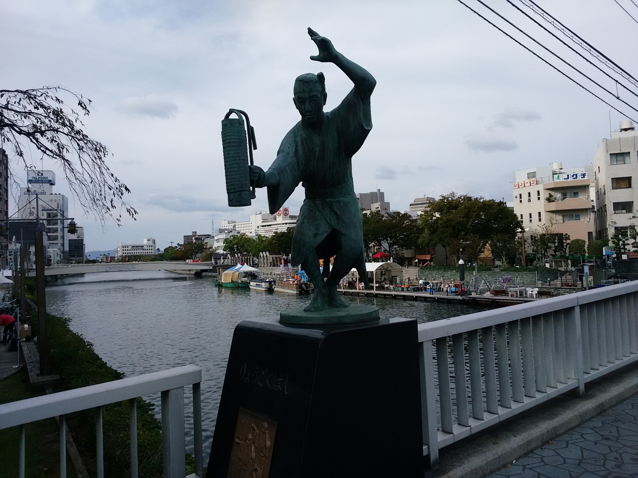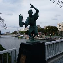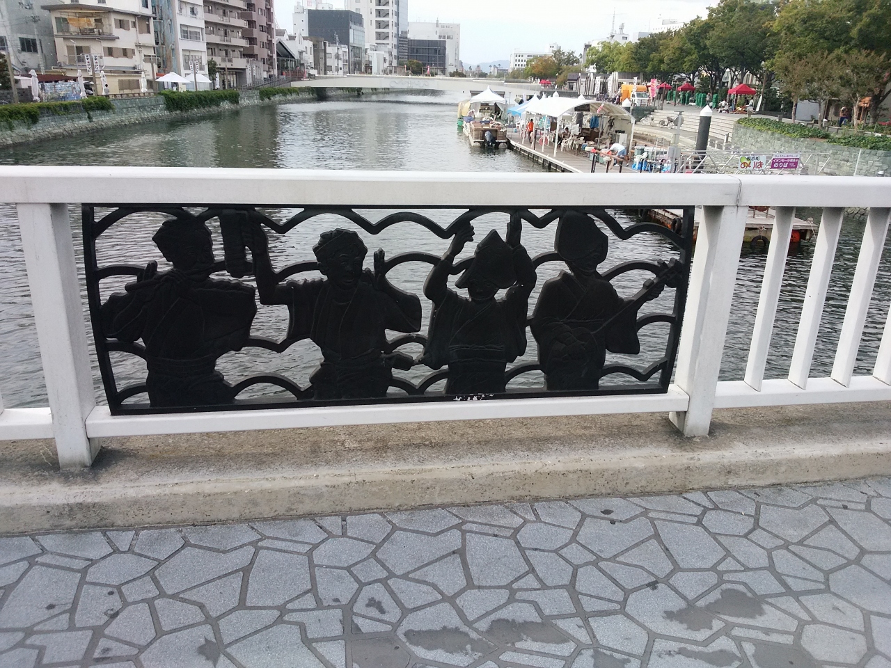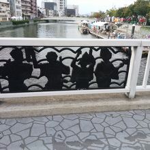 徳島駅近くのホテルから阿波おどり会館へ行く道すがらにある、新町川に架かる橋で、橋の欄干に阿波踊りの踊り手のモチーフがあり、徳島にはいたる所に、阿波おどりの表示があり、阿波おどり観光に一役も二役も買って居ます。