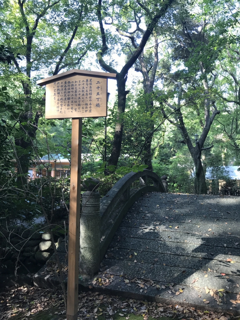 尾張名所図会や名古屋甚句で名高く板石が二十五枚並んでいることから二十五丁橋所言われている甚句には、西行法師が腰をかけ東西南北を見渡してこれ程涼しいこれの字をたるが熱田と名付けられたといい伝えられております。