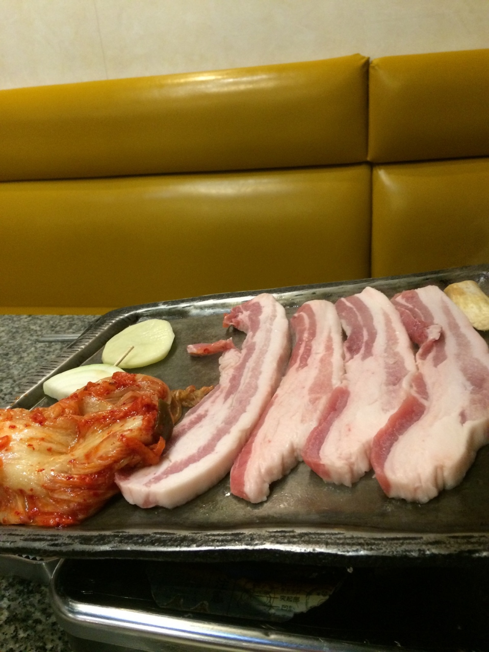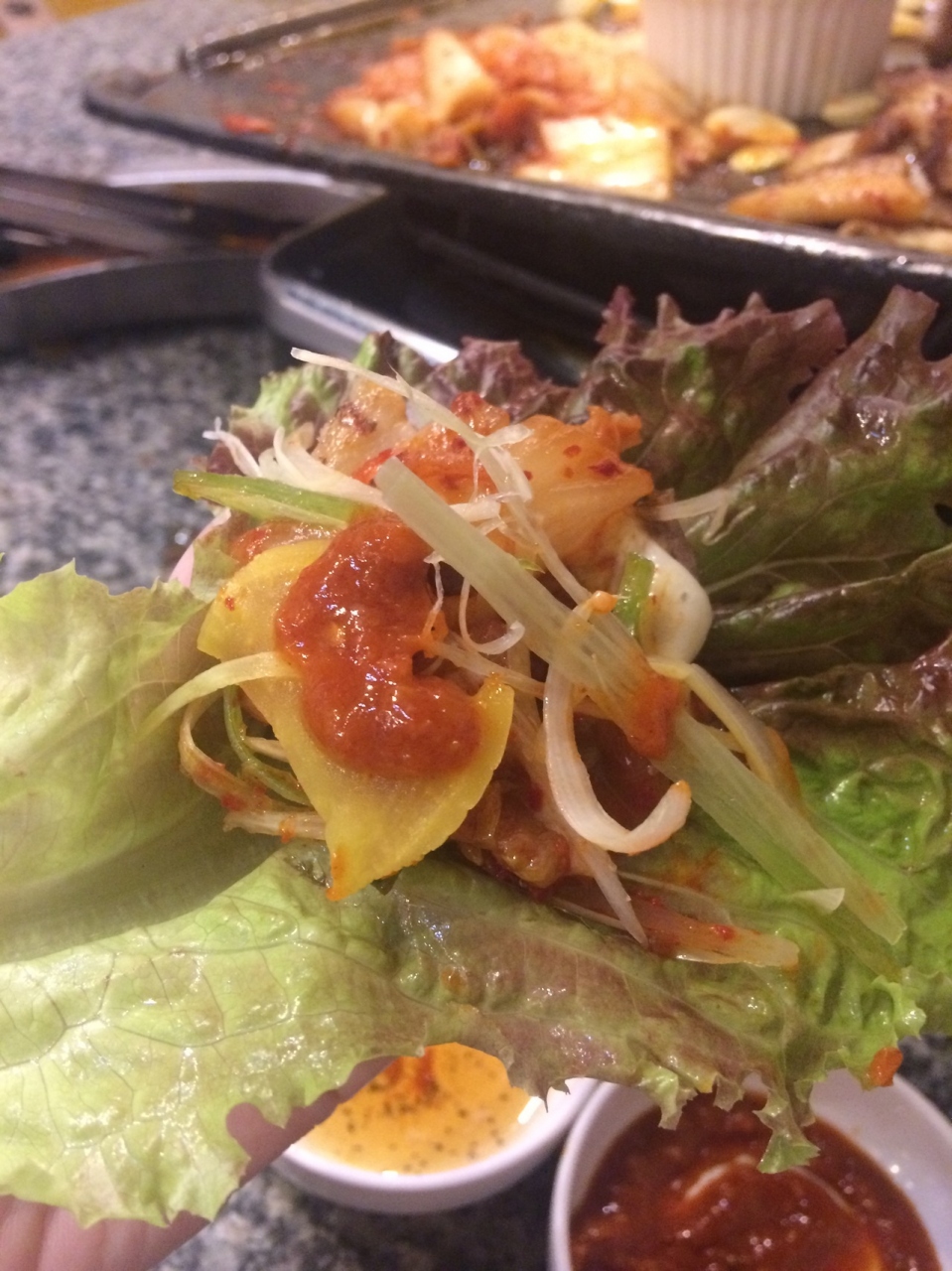 お肉と焼きキムチとニンニクを巻いて食べるのは楽しいです。