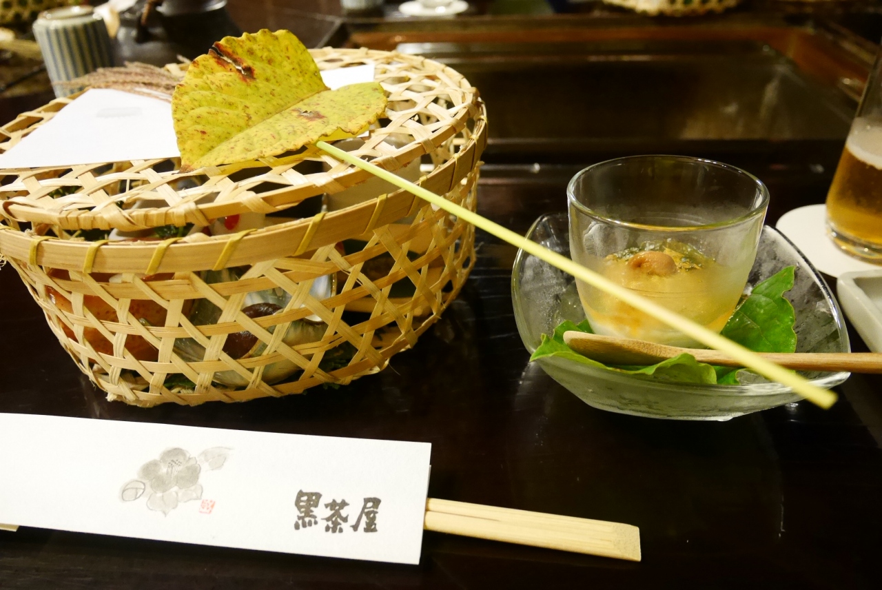 メインは炭火焼か朴葉焼を選ぶことが出来ます。今回は川魚と鶏肉の炭火焼を選択。先付から始まり前菜、椀、メインの焼物・・・と続くコース料理。目の前の炭火で焼くお魚はとても美味しい。竹の器も美味しさを増してくれます。