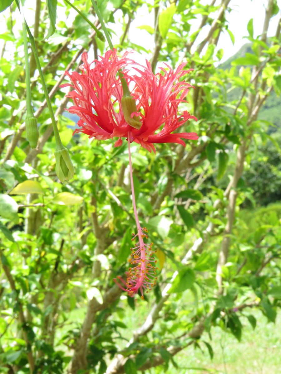 そこから歩いて5分ほどで展望台の東屋へ着きます。歩道の回りは、さまざまなハイビスカスが植えてあります。ちょっと珍しいのをみつけました。