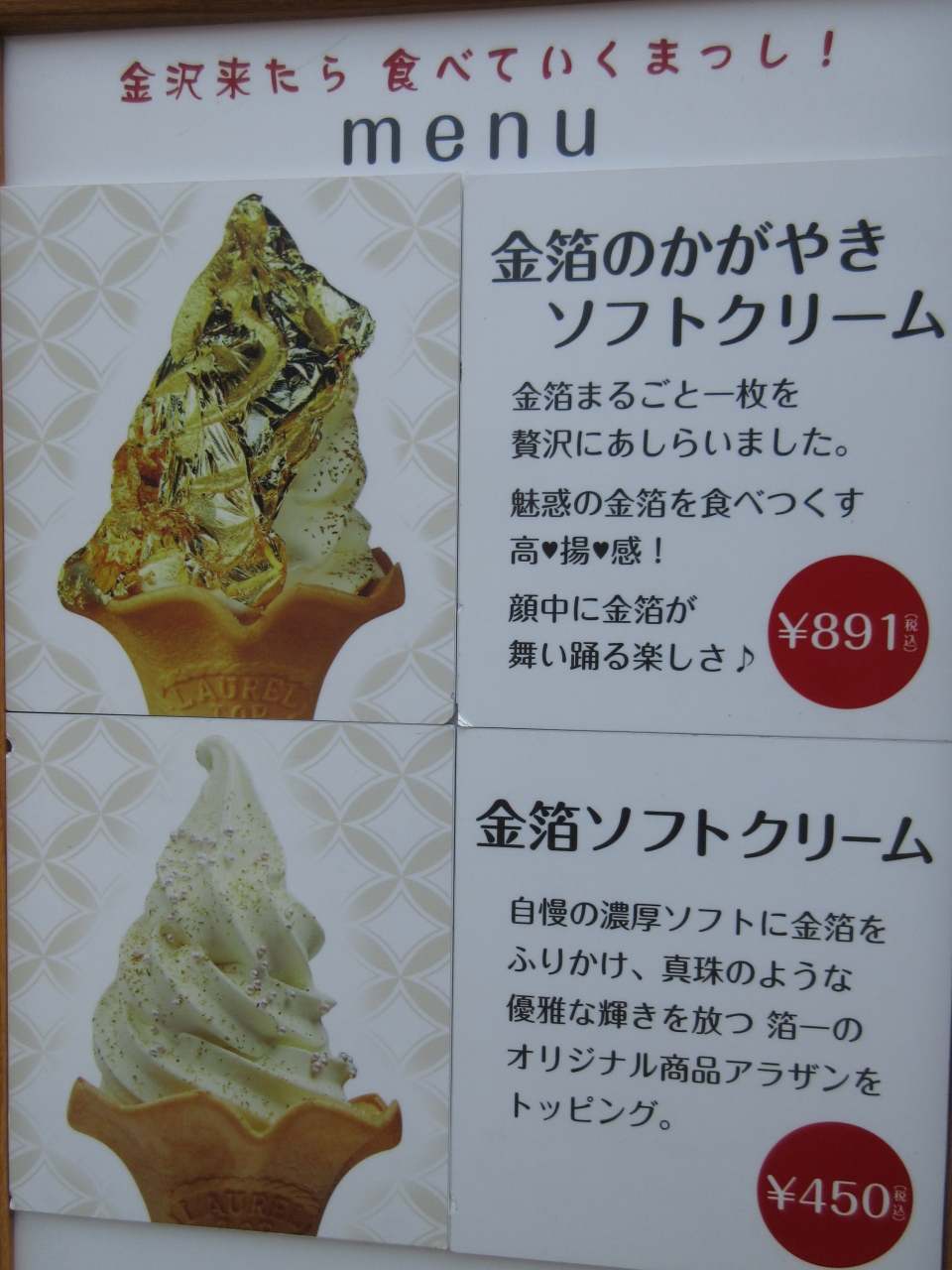 兼六園に向かう紺屋坂の途中にある店です。金箔が貼られたり、金粉がふりかけられたソフトクリームを販売していました。金沢らしいソフトクリームと言えるかと思いますが、かなりいい値段でした。外国人には珍しいのか、グループやカップルで1つ購入し、仲良く食べている姿が印象的でした。旅行中に入ったすし屋でも握りに金粉がふりかけられていました。金を使った商品や食品は、金沢の大切なアピールポイントだと感じました。