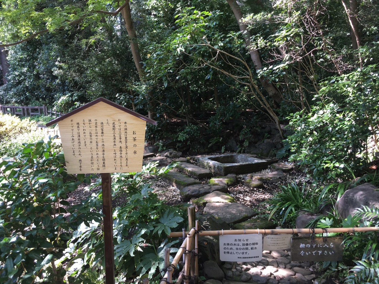 井の頭公園の中にあります。井の頭弁天の近くにありました。徳川家康がこの湧水でお茶を飲んだことから、とても有名な湧き水のようですが、今は水が湧いて出ているわけではなくて、ポンプで組み上げているのだそうです。思つたよりも小さな場所でした。