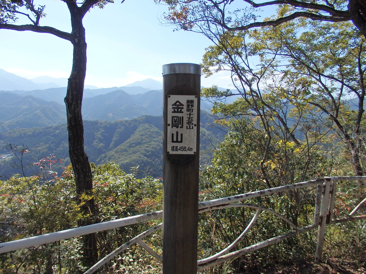 藤野駅から45分一本松山山頂通過、一度舗装道を歩く。道中、芸術の道のオブジェが立っている。鉄板を溶接したもの、丸石を3つ配置したもの、石を組み立てたもの等が展示されていましたが、芸術音痴の私には理解できませんでした。1時間10分で金剛山の登山口、急登り、やせ尾根を過ぎ鶴島金剛山(491M)山頂に到着。来た道を戻り、20分後名倉金剛山(418M)に到着。南が開け丹沢山系が見える。絶景である。眼下には藤野やまなみ温泉施設が見える。ほぼ来た道を引き返し、藤野駅に向かう。コウヤボウキ、リンドウ、ノギク、シロヨメナ、カメバヒキオコシ等秋の野花が見られました。本日のコース,標高差は300M弱であり歩き易いコースであった