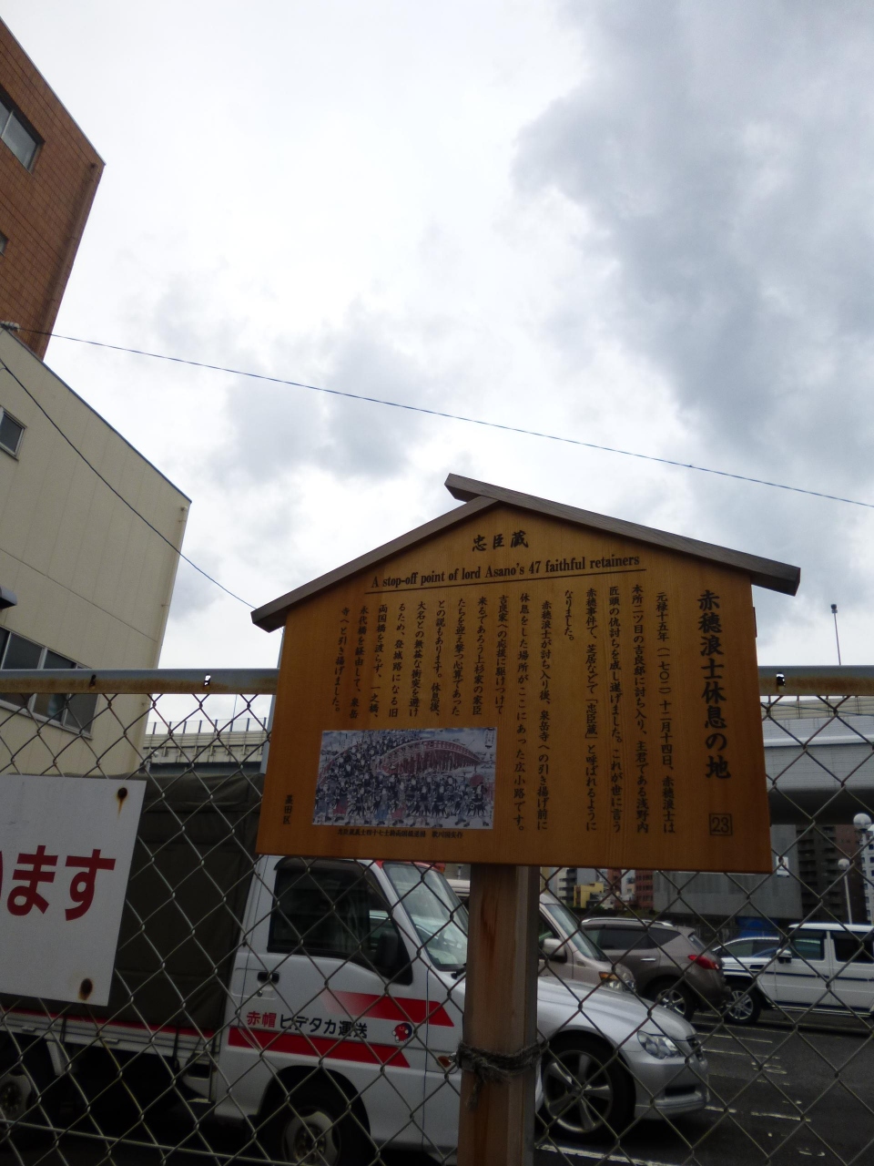 両国橋の東側には、吉良上野介の屋敷があったことから、赤穂浪士討ち入りのゆかりの場所が多いです。両国橋南側のこの場所にも、3枚の高札が掲げらています。そのうちの一枚がこの高札です。ここが、旧両国橋のたもとであったことから。討ち入り後の集合場所であり、ここで休息を取って、泉岳寺に向かったそうです。現在は首都高の前に駐車場という場所ですが、当時を想像してみるのに、高札は有難いです。