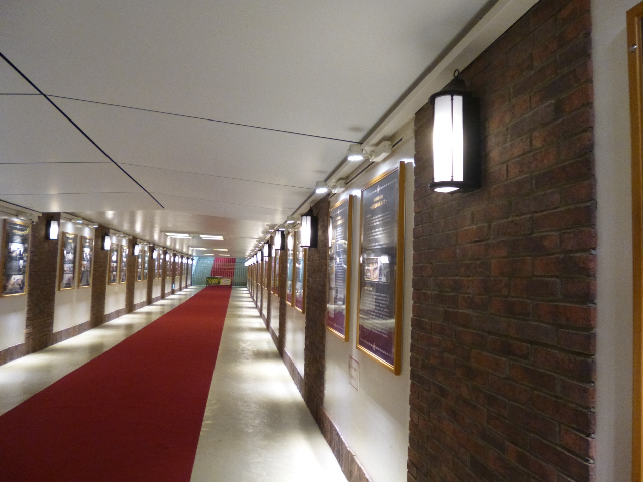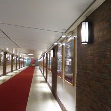 両国駅、ホームから国技館方面を見ると、低いところに3番線ホームがあります。このホームに繋がる通路が、ステーションギャラリーとして使われています。団体やイベントなど、特別の時にしか使われない、三番ホームですが、赤絨毯が入り口まで続く様子は、特別館があり、面白いです。ギャラリーでは、両国駅の歴史がわかる写真が展示さえていました。