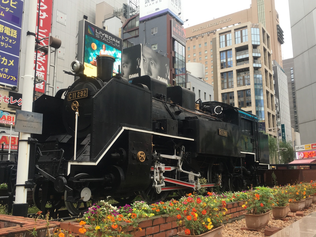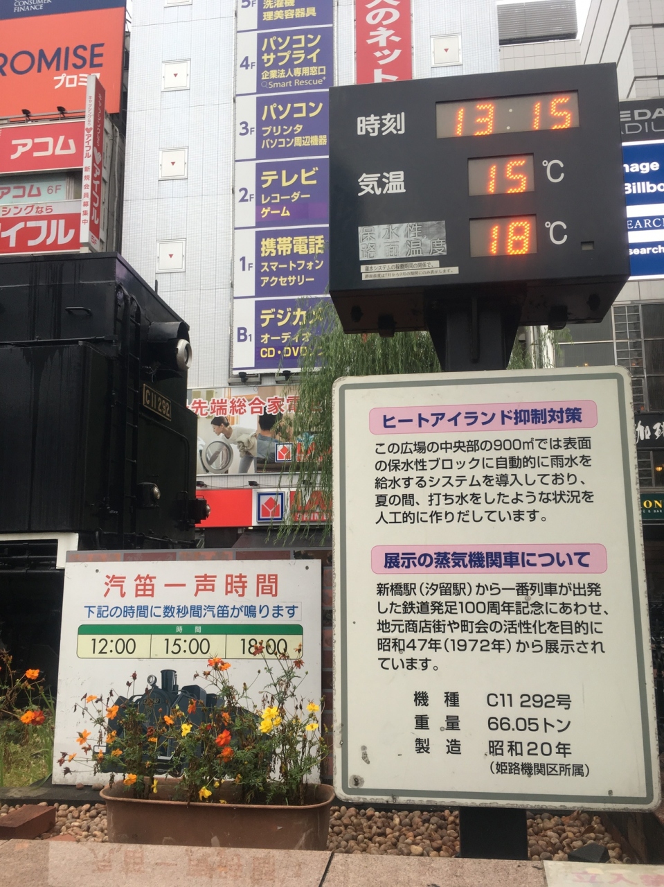 新橋の駅前で、汐留とは反対側の日比谷口の駅前広場。ここには鉄道開業100周年を記念してC11形SLが展示されている。はじめて列車が走ったのが新橋ですが、この列車はこの駅付近では走っていなかったとか。昔も今も新橋で待ち合わせと言ったら必ずここです。