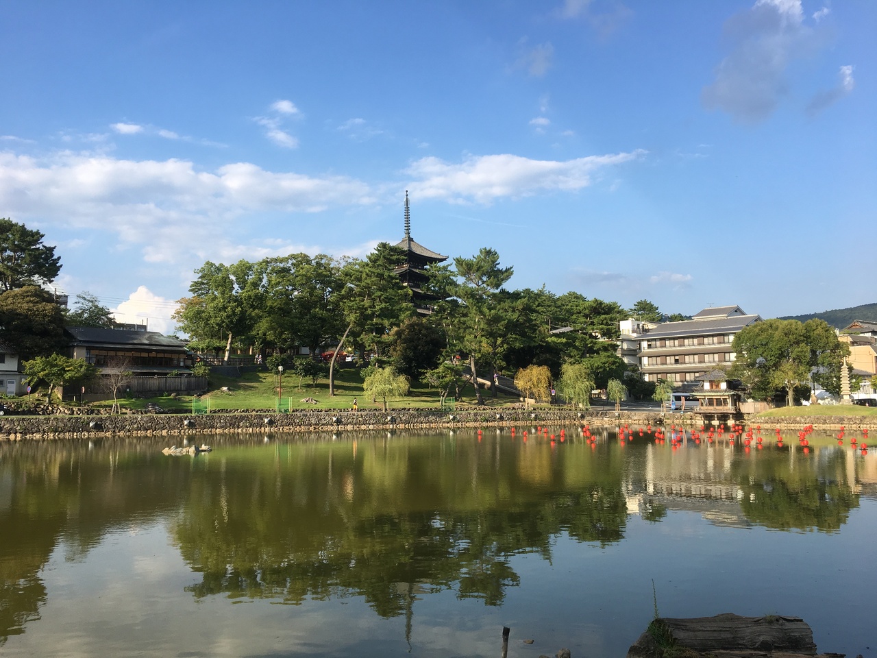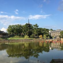 近鉄奈良駅から徒歩5分ほどの場所にあります。駅から商店街~ならまちを経て最後に訪れるのがおすすめです。鳩が沢山いて観光客の方が餌をあげては群がっています。この日は天気も良く対岸の塔が水に映っていい感じでした。