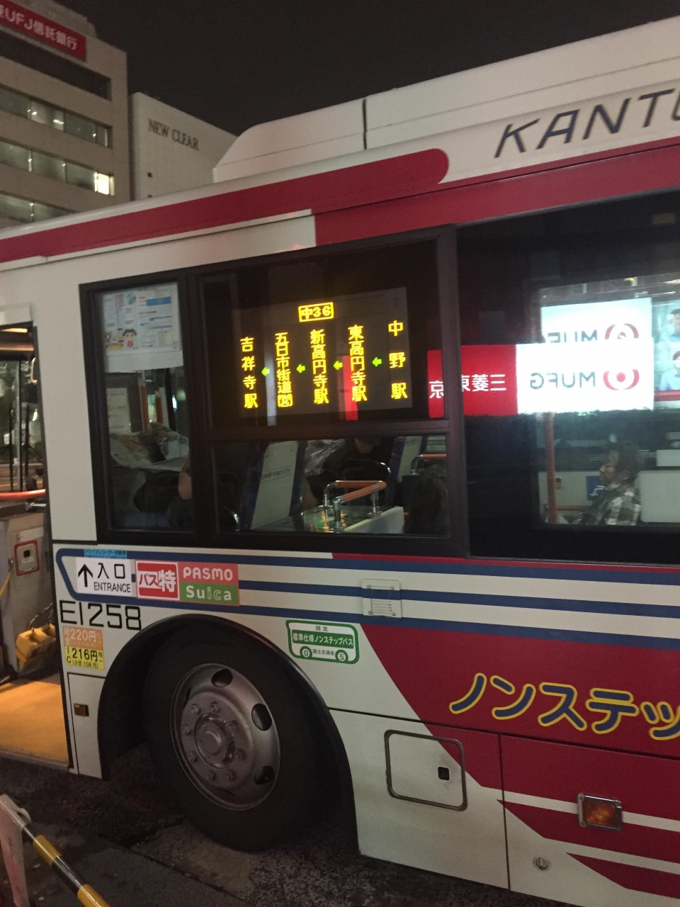 中野から新高円寺まで乗車しました。吉祥寺行きですが、東高円寺や新高円寺といった丸の内線の駅に行くなら便利です。何せ駅前を通るので。以前はスリードアだった関東バスも今はツードアタイプを採用しています。そしてノンステップバス。色々と進化しています。ただカラーリングは昔のまま。遠くからでもすぐに判別することが出来ますね。