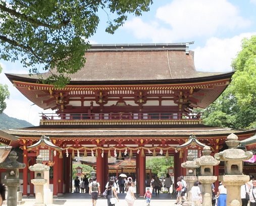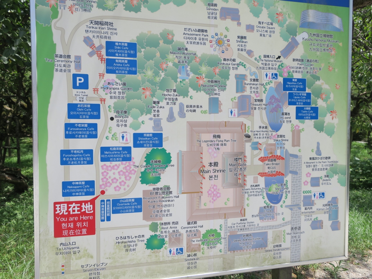 本殿の裏の方まで行ってみると、お食事や休憩ができそうな〇〇茶屋というお店が何軒かありましたが、こちらも静かではなかったので、そのまま本殿をぐるっと回って、混みあう太鼓橋や参道を避けて宝物殿の方に行ってみました。すると九州国立博物館の名前が目に入ったのでそのまま進んでみました。エスカレーターで上った先にある博物館はとても素敵で、こちらにもっと時間を費やすべきだったと後悔・・
