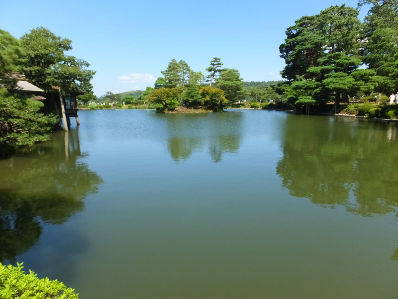 さて、サザエ山を外から見ると、、、なんと松の木の高さの方が高く、山はその中に埋もれてさっぱりわかりませんでした。昔は松の木も低く、目立っていたと思います。その時代を想像しながら霞ヶ池越しにサザエ山を鑑賞しましょう。